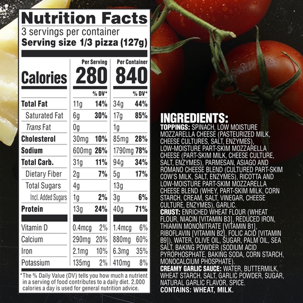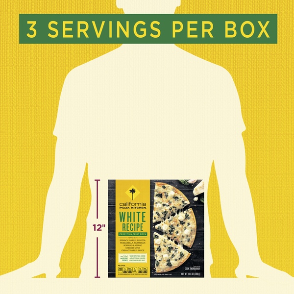 Details Ingredients Crust: Enriched Wheat Flour (Wheat Flour, Niacin [Vitamin B3], Reduced Iron, Thiamin Mononitrate [Vitamin B1], Riboflavin [Vitamin B2], Folic Acid [Vitamin B9]), Water, Olive Oil, Sugar, Palm Oil, Sea Salt, Baking Powder (Sodium Acid Pyrophosphate, Baking Soda, Corn Starch, Monocalcium Phosphate)., Toppings: Spinach, Low Moisture Mozzarella Cheese (Pasteurized Milk, Cheese Cultures, Salt, Enzymes), Low-Moisture Part-Skim Mozzarella Cheese (Part-Skim Milk, Cheese Culture, Salt, Enzymes), Parmesan, Asiago and Romano Cheese Blend (Cultured Part-Skim Cow's Milk, Salt, Enzymes), Ricotta and Low-Moisture Part-Skim Mozzarella Cheese Blend (Whey, Part-Skim Milk, Corn Starch, Cream, Salt, Vinegar, Cheese Culture, Enzymes), Garlic., Creamy Garlic Sauce: Water, Buttermilk, Wheat Starch, Salt, Garlic Powder, Sugar, Natural Garlic Flavor, Spice.. Show more Product features At CALIFORNIA PIZZA KITCHEN, we want you to grab delicious and fresh flavor experiences by the slice, and be inspired by unique tastes. We bring you these delightful flavors by always using real cheese, no artificial flavors, and a preservative-free crust. We crafted this White Recipe Pizza using premium ingredients like ricotta cheese, creamy garlic sauce, a little garlic on top, and leafy green spinach, all on a crispy, thin crust. Discover deliciousness in your own kitchen with our frozen pizza masterpieces, cooked hot and fresh by you. CALIFORNIA PIZZA KITCHEN? is a trademark owned and licensed by CPK Management Company. White Recipe Crispy Thin Crust Frozen Pizza with spinach, creamy garlic sauce, 100% real cheese, and no artificial flavors We source premium ingredients and create delicious combinations, so every bite is made to please A frozen pizza that always impresses. It's the quality of CALIFORNIA PIZZA KITCHEN? cooked fresh at home Easy to cook. Preheat your oven, remove all packaging, and cook for 12-13 minutes. Don't forget to recycle the box and clean cardboard circle The CALIFORNIA PIZZA KITCHEN Real Ingredient Promise is our commitment to use real cheese and no artificial flavors, all on a preservative-free crust Net Quantity of Content 3.0 X 1/3 Pizza (127g) Per Serving