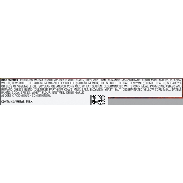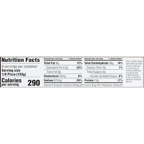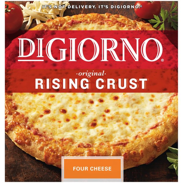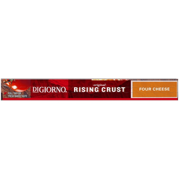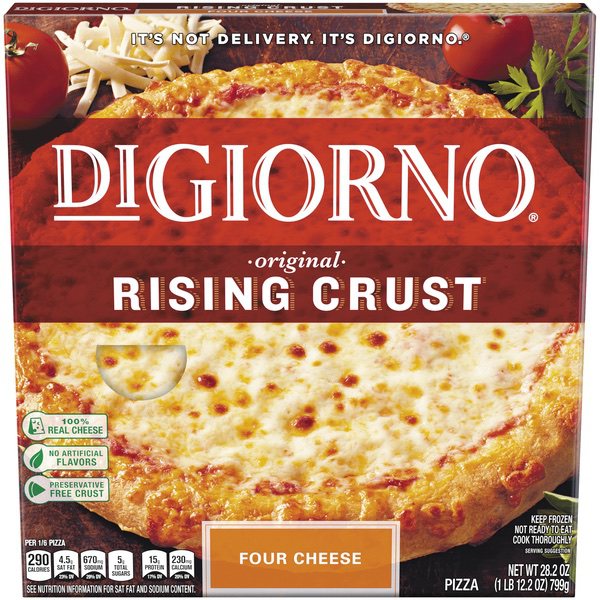 Details Ingredients Enriched Wheat Flour (Wheat Flour, Niacin, Reduced Iron, Thiamine Mononitrate, Riboflavin, Folic Acid), Water, Low-Moisture Part-Skim Mozzarella Cheese (Part-Skim Milk, Cheese Culture, Salt, Enzymes), Tomato Paste, Sugar, 2% or Less of Vegetable Oil (Soybean Oil and/or Corn Oil), Wheat Gluten, Degerminated White Corn Meal, Parmesan, Asiago and Romano Cheese Blend (Cultured Part-Skim Cow's Milk, Salt, Enzymes), Yeast, Salt, Degerminated Yellow Corn Meal, DATEM, Baking Soda, Spices, Wheat Flour, Enzymes, Dried Garlic, Ascorbic Acid (Dough Conditioner). Show more Product features The DIGIORNO Rising Crust Four Cheese pizza is made with only the very best: California vine-ripened tomatoes, real mozzarella cheese, a preservative-free crust, and is loaded with four cheeses. We made pizza history when we put this one on the menu! The DIGIORNO Original Rising Crust bakes up crispy on the outside and soft and tender on the inside. The self-rising crust has four cheeses that are paired with our signature sauce for the fresh-baked taste of delivery pizza in your very own home. IT'S NOT DELIVERY. IT'S DIGIORNO. Vine-ripened tomatoes Real Mozzarella Cheese Good source of calcium (see nutrition information for Saturated Fat, and Sodium content) Special Features Made with 100% real cheese Net Quantity of Content 6.0 X 1/6 pizza (133g)
