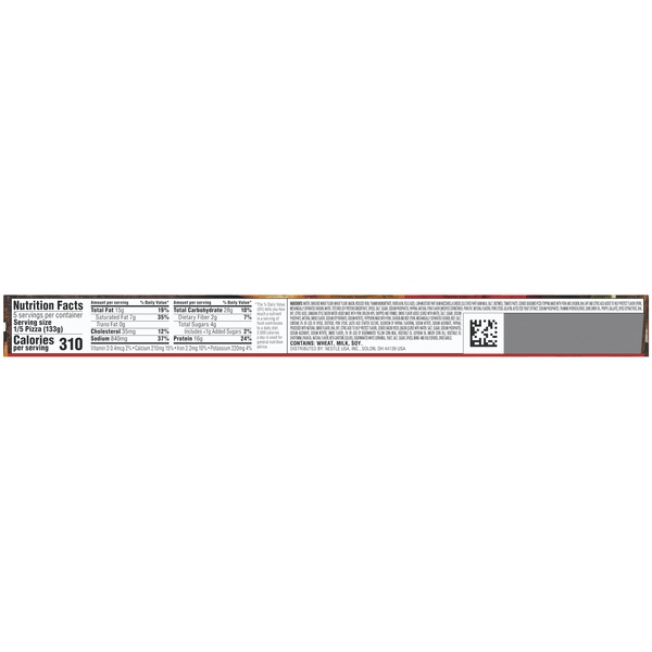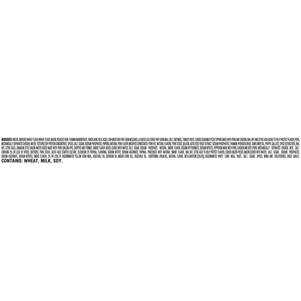 Details Ingredients Water, Enriched Wheat Flour (Wheat Flour, Niacin, Reduced Iron, Thiamin Mononitrate, Riboflavin, Folic Acid), Low-Moisture Part-Skim Mozzarella Cheese (Cultured Part-Skim Milk, Salt, Enzymes), Tomato Paste, Cooked Seasoned Pizza Topping Made with Pork and Chicken, BHA, BHT, and Citric Acid Added to Help Protect Flavor (Pork, Mechanically Separated Chicken, Water, Textured Soy Protein Concentrate, Spices, Salt, Sugar, Sodium Phosphates, Paprika, Natural Pork Flavor [Modified Cornstarch, Pork Fat, Natural Flavors, Pork Stock, Gelatin, Autolyzed Yeast Extract, Sodium Phosphates, Thiamine Hydrochloride, Sunflower Oil, Propyl Gallate], Spice Extractives, BHA, BHT, Citric Acid), Canadian Style Bacon Water Added Made with Pork Sirloin Hips, Chopped and Formed, Smoke Flavor Added (Cured with Water, Salt, Sugar, Sodium Phosphate, Natural Smoke Flavor, Sodium Erythorbate, Sodium Nitrite), Pepperoni Made with Pork, Chicken and Beef (Pork, Mechanically Separated Chicken, Beef, Salt, Contains 2% or Less of Spices, Dextrose, Pork Stock, Lactic Acid Starter Culture, Oleoresin of Paprika, Flavoring, Sodium Nitrite, Sodium Ascorbate, Paprika, Processed with Natural Smoke Flavor, BHA, BHT, Citric Acid to Help Protect Flavor), Cooked Bacon Pieces (Bacon [Cured with Water, Salt, Sugar, Sodium Phosphates, Sodium Ascorbate, Sodium Nitrite], Smoke Flavor), 2% or Less of Degerminated Yellow Corn Meal, Vegetable Oil (Soybean Oil and/or Corn Oil), Vegetable Oil Shortening (Palm Oil, Natural Flavor, Beta Carotene [Color]), Degerminated White Corn Meal, Yeast, Salt, Sugar, Spices, Mono- and Diglycerides, Dried Garlic. Show more Product features DIGIORNO Original Thin Crust Four Meat pizza is made with only the very best: California vine-ripened tomatoes, real mozzarella cheese, a preservative-free crust, and loaded with four meats. It's no wonder DIGIORNO Classic Thin Crust is a traditional favorite on our menu, because it bakes up soft and tender on the inside and wonderfully crispy on the outside. Plus, it's loaded with cheese and lots of big, juicy toppings right from your oven. Why order out? It's Not Delivery. It's DIGIORNO. Sausage, pepperoni, Canadian-style Bacon, and Bacon Good source of calcium (see nutrition information for Saturated Fat, and Sodium content) Real Mozzarella Cheese Special Features Made with 100% real cheese Net Quantity of Content 5.0 X 1/5 Pizza (133g)