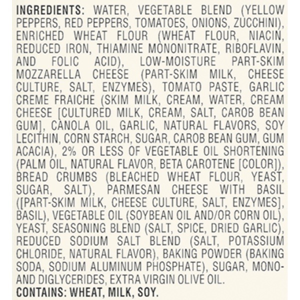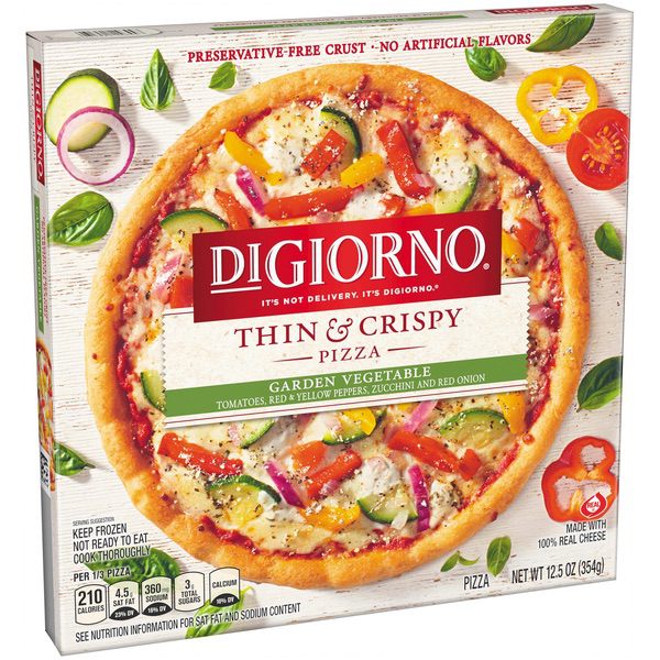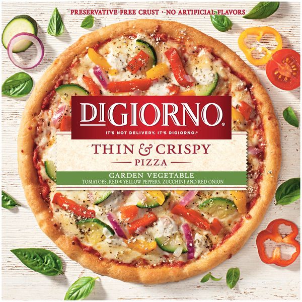 Details Ingredients Water, Vegetable Blend (Yellow Peppers, Red Peppers, Tomatoes, Onions, Zucchini), Enriched Wheat Flour (Wheat Flour, Niacin, Reduced Iron, Thiamine Mononitrate, Riboflavin, and Folic Acid), Low-Moisture Part-Skim Mozzarella Cheese (Part-Skim Milk, Cheese Culture, Salt, Enzymes), Tomato Paste, Garlic Creme Fraiche (Skim Milk, Cream, Water, Cream Cheese [Cultured Milk, Cream, Salt, Carob Bean Gum], Canola Oil, Garlic Natural Flavors, Soy Lecithin, Corn Starch, Sugar, Carob Bean Gum, Gum Acacia), Vegetable Oil Shortening (Palm Oil, Natural Flavor, Beta Carotene), Bread Crumbs (Bleached Wheat Flour, Yeast, Sugar, Salt), Parmesan Cheese with Basil ([Part-Skim Milk, Cheese Culture, Salt, Enzymes], Basil), Vegetable Oil (Soybean Oil and/or Corn Oil), Yeast, Seasoning Blend (Salt, Spice, Dried Garlic), Reduced Sodium Salt Blend (Salt, Potassium Chloride, Natural Flavor), Baking Powder (Baking Soda, Sodium Aluminum Phosphate), Sugar, Mono-and Diglycerides, Extra Virgin Olive Oil. Show more Product features There are many reasons for you to enjoy a delicious DIGIORNO Thin & Crispy Garden Vegetable pizza: fresh-tasting, flavorful ingredients, and a delicious thin, crispy crust made from enriched wheat flour. Enjoy the crispy side of life fresh from your oven with our Thin & Crispy Pizzas. Made without artificial flavors, this pizza has a crust that's preservative-free and bakes to a perfect crispiness. IT'S NOT DELIVERY. IT'S DIGIORNO. Preservative-free crust No artificial flavors Made with 100% real cheese Net Quantity of Content 3.0 X 1/3 Pizza (118g) Per Serving