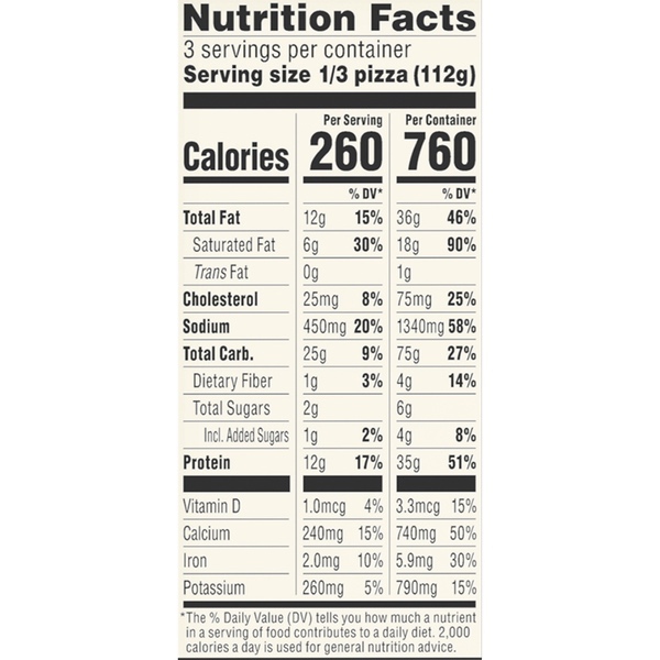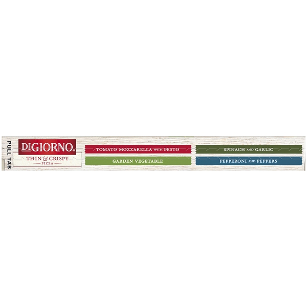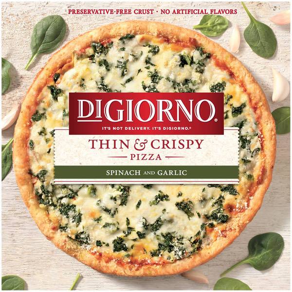 Details Ingredients Water, Enriched Wheat Flour (Wheat Flour, Niacin, Reduced Iron, Thiamin Mononitrate, Riboflavin, and Folic Acid), Low-Moisture Part-Skim Mozzarella Cheese (Part-Skim Milk, Cheese Culture, Salt, Enzymes), Spinach Blend (Spinach, Garlic), Tomato Paste, Garlic Creme Fraiche (Skim Milk, Cream, Water, Cream Cheese [Cultured Milk, Cream, Salt, Carob Bean Gum], Canola Oil, Garlic, Natural Flavors, Soy Lecithin, Corn Starch, Modified Cellulose, Sodium Stearoyl Lactylate, Mono- & Diglycerides, Food Starch Modified, Sugar, Sorbic Acid, and Carrageenan), Mozzarella Cheese (Milk, Skim Milk, Cheese Culture, Salt, Enzymes), Parmesan, Asiago, and Romano Cheeses Made from Cow's Milk (Part-Skim Milk, Cheese Culture, Salt, Enzymes, Natamycin), Vegetable Oil Shortening (Palm Oil, Natural Flavor, Beta Carotene), Bread Crumbs (Bleached Wheat Flour, Yeast, Sugar, Salt), Vegetable Oil (Soybean Oil and/or Corn Oil), Yeast, Reduced Sodium Salt Blend (Salt, Potassium Chloride, Natural Flavor), Baking Powder (Baking Soda, Sodium Aluminum Phosphate), Seasoning Blend (Salt, Spice, Dried Garlic), Sugar, Mono- and Diglycerides, Extra Virgin Olive Oil. Show more Product features There are many reasons for you to enjoy a delicious DIGIORNO Thin & Crispy Spinach and Garlic pizza: Fresh-tasting, flavorful ingredients, a delicious thin, crispy crust made from enriched wheat flour, flavorful tomato sauce made from vine-ripened, California tomatoes, topped with real cheese, spinach, and a delicious creme fraiche sauce. Enjoy the crispy side of life with our Thin & Crispy Pizzas. Made without artificial flavors, this pizza has a crust that's preservative-free and bakes to a perfect crispiness. IT'S NOT DELIVERY. IT'S DIGIORNO. Preservative-free crust No artificial flavors Made with 100% real cheese Net Quantity of Content 3.0 X 1/3 Pizza (112g) Per Serving