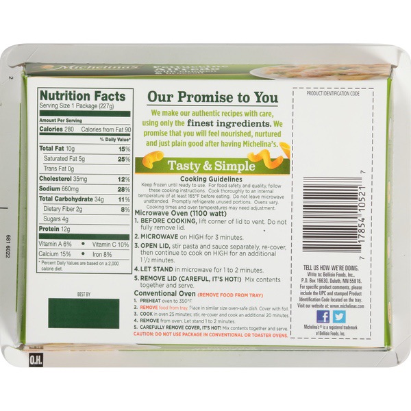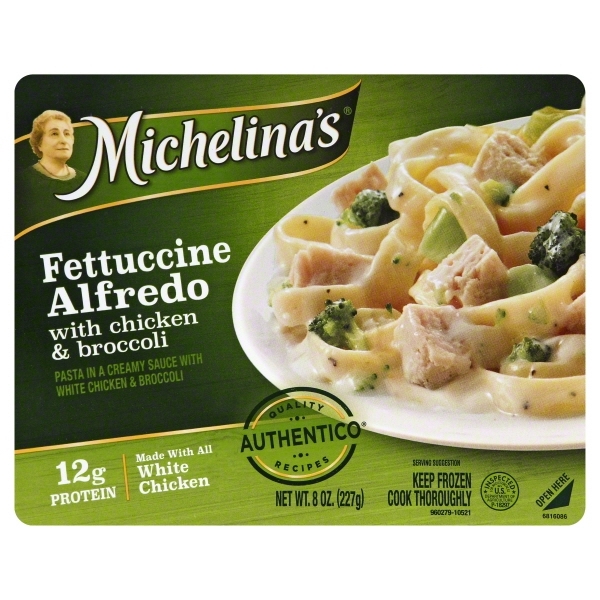 Details Ingredients COOKED ENRICHED MACARONI PRODUCT (WATER, DURUM SEMOLINA [ENRICHED WITH NIACIN, FERROUS SULFATE, THIAMINE MONONITRATE, RIBOFLAVIN, FOLIC ACID]), HALF AND HALF (MILK, CREAM), WATER, BROCCOLI, COOKED WHITE CHICKEN (CHICKEN BREAST WITH RIB MEAT, WATER, SOY PROTEIN ISOLATE, 2% OR LESS OF SALT, SODIUM PHOSPHATE, MODIFIED FOOD STARCH, MALTODEXTRIN AND NATURAL FLAVOR), LESS THAN 2 % OF GRATED CHEESE BLEND (PARMESAN AND ASIAGO CHEESES [CULTURED MILK, SALT, ENZYMES], NATURAL FLAVOR, CELLULOSE, SALT), WHITE CHEDDAR CHEESE (PASTEURIZED MILK, CHEESE CULTURE, SALT, ENZYMES), CHEESE FLAVOR (ENZYME MODIFIED CHEESE AND BUTTER [CHEDDAR CHEESE {PASTEURIZED MILK, CHEESE CULTURE, SALT, ENZYMES}, BUTTER, CHEESE CULTURE, ENZYMES], WHEY, BUTTERMILK SOLIDS, SALT, SODIUM PHOSPHATE, LACTIC ACID), MODIFIED FOOD STARCH, SALT, CANOLA OIL, YEAST EXTRACT, CHICKEN BROTH FLAVOR (CHICKEN BROTH, SALT, FLAVORS, CHICKEN POWDER), ROMANO CHEESE BLEND (ROMANO CHEESE [PASTEURIZED COW'S MILK, CHEESE CULTURES, SALT, ENZYMES], NATURAL FLAVOR, CELLULOSE, SALT), NONFAT MILK SOLIDS (NONFAT MILK, WHEY SOLIDS [LACTOSE], VITAMIN A AND D3), SPICE, XANTHAN GUM, DISODIUM PHOSPHATE. Show more Product features Michelina's Traditional Fettuccine Alfredo with Chicken & Broccoli features tender chunks of white chicken with crisp broccoli tossed with fettuccine and a creamy Alfredo sauce. Fettuccine Alfredo, with Chicken & Broccoli Pasta in a creamy sauce with white chicken & broccoli. 12 g protein. Made with all white chicken. Inspected for wholesomeness by US Department of Agriculture. Quality recipes. Our Promise to You: We make our authentic recipes with care, using only the finest ingredients. We promise that you will feel nourished, nurtured and just plain good after having Michelina's. Tasty & Simple. Tell us how we're going. Write to: Bellisio Foods, Inc., PO Box 16630, Duluth, MN 55816. For specific product comments, please include the UPC and stamped Product Identification Code located on the tray. Visit our website at: www.michaelinas.com. Facebook. Twitter. Special Features Made with white chicken Net Quantity of Content 1 X 227 g