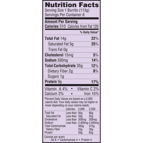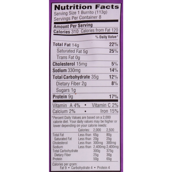 Details Ingredients Water, Wheat Flour (Enriched With Niacin, Reduced Iron, Thiamin Mononitrate, Riboflavin, Folic Acid), Beef, Beans, Vegetable Oil (Soybean, Canola and/or Corn Oil), Contains 2% or Less Textured Vegetable Protein (Soy Flour, Caramel Color), Isolated Pea Product, Salt, Chili Pepper, Dough Conditioners (Yeast, Wheat Gluten, Sugar, Guar Gum, Food Starch, Sodium Metabisulfite), Spices, Flavor, Savory Flavor (Yeast Extract, Soy Sauce [Wheat, Soybeans, Salt], Maltodextrin, Lactic Acid, Calcium Lactate, Salt). Show more Product features El Monterey Chicken, Rice & Beans Burritos are perfect for a quick lunch or a family dinner. In just a few minutes of prep time, you’ll be digging into flavorful chicken, delicious rice, savory beans, and authentic Mexican spices wrapped in an oven-baked flour tortilla. Make sure to keep your freezer stocked with these packaged frozen burritos. Your family will devour them! Made with real beef No artificial colors 9 grams of protein Authentic recipe Ready in minutes out of the oven At El Monterey, we promise to bring you the best Mexican food - always. Family owned since 1964 Special Features Family pack Net Quantity of Content 8.0 X 1 Burrito (113g)