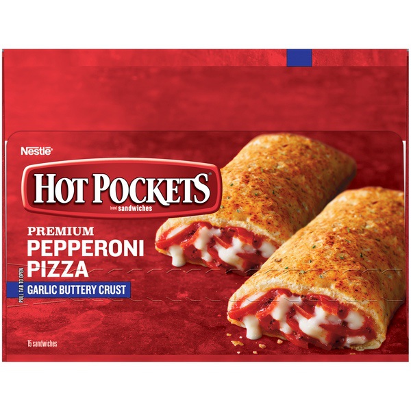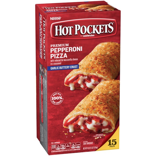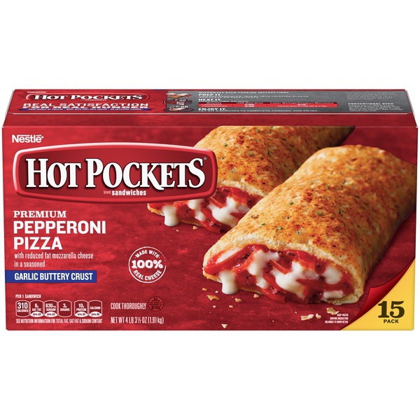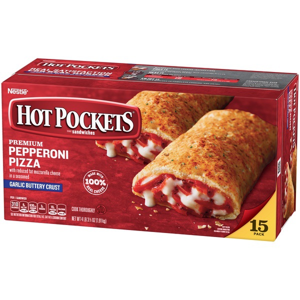Details Ingredients Enriched Flour (Wheat Flour, Malted Barley Flour, Niacin, Iron, Thiamine Mononitrate, Riboflavin, Folic Acid), Water, Reduced Fat Mozzarella Cheese (Pasteurized Part Skim Milk, Nonfat Milk, Modified Food Starch*, Cultures, Salt, Vitamin A Palmitate, Enzymes *Ingredients Not in Regular Mozzarella Cheese), Pepperoni (Pork, Beef, Salt, Contains 2% or Less of Water, Dextrose, Spices, Lactic Acid Starter Culture, Oleoresin of Paprika, Garlic Powder, Sodium Nitrite, BHA, BHT, Citric Acid [to Protect Flavor]), Tomato Paste, Soybean Oil, 2% or Less of Sugar, Seasoning (Bread Crumb [Bleached Wheat Flour, Dextrose, Yeast, Salt], Dried Garlic, Tomato Powder, Spice, Salt, Dextrose, Dried Onion, Maltodextrin, Citric Acid, Natural Flavor), Fractionated Palm Oil, Yeast, Salt, Modified Food Starch, Dough Conditioner Blend (Calcium Sulfate, Salt, L-Cysteine Hydrochloride, Garlic Powder, Tricalcium Phosphate, Enzymes), Dried Garlic, Soy Lecithin, Sodium Stearoyl Lactylate, Methylcellulose, Flavor (Maltodextrin, Modified Corn Starch, Natural Flavors, Datem, Medium Chain Triglycerides), Spices, Dried Onions, Seasoning (Maltodextrin, Modified Corn Starch, Butter Flavor), Whey, Maltodextrin, Potassium Chloride, Citric Acid, Soy Flour, Egg Whites. Show more Product features Kids are always moving and always hungry. You need a serious snack that can keep them satisfied for hours. HOT POCKETS are the perfect solution. They cook in minutes, fit in one hand, and are a good source of protein to keep your kids feeling full. Made with 100% real cheese, this Pepperoni Pizza Hot Pocket is filled with premium, sliced pepperoni and reduced-fat mozzarella cheese, all wrapped in a warm, garlic, buttery crust. Be sure you've always got HOT POCKETS in the freezer so you can feed the masses whenever hunger strikes. Premium Pepperoni Pizza HOT POCKETS, 15 snacks in this box Contains 10 grams of protein per sandwich Made with 100% real cheese Filled with premium, sliced pepperoni and reduced-fat mozzarella cheese, all wrapped in a garlic buttery crust With just 2 minutes of cooking time in your microwave, HOT POCKETS are an easy and convenient snack Net Quantity of Content 15.0 X 1 Sandwich (127g)