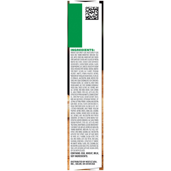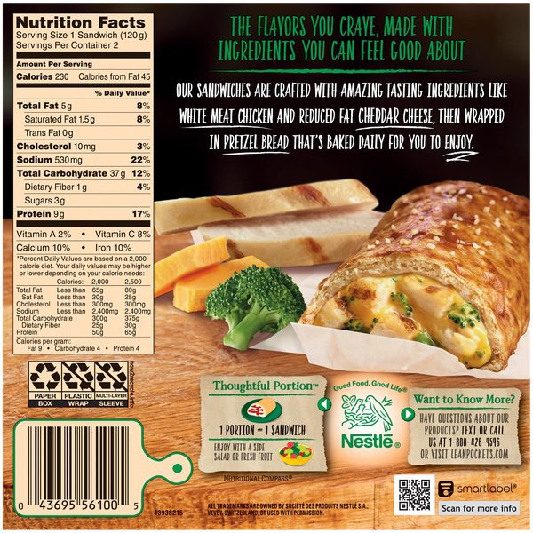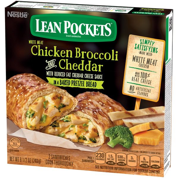 Details Ingredients Enriched Flour (Wheat Flour, Malted Barley Flour, Niacin, Iron, Thiamine Mononitrate, Riboflavin, Folic Acid), Water, Cooked Grill Marked White Meat Chicken Strips (White Meat Chicken, Water, Isolated Soy Protein, Modified Rice Starch, Chicken Flavor [Dehydrated Chicken Broth, Chicken Powder, Natural Flavor], Sodium Phosphate, Salt), Broccoli, Reduced Fat Cheddar Cheese (Pasteurized Part Skim Milk, Skim Milk, Modified Food Starch*, Cultures, Salt, Flavors*, Potassium Chloride*, Annatto, Vitamin A Palmitate, Enzymes, *Ingredients Not in Regular Cheddar Cheese), 2% or Less of Soybean Oil, Maltodextrin, Onions, Modified Food Starch, Whey, Sugar, Seasoning (Rice Flour, Corn Starch, Potassium Chloride, Salt, Coconut Oil, Wheat Starch, Sodium Alginate), Salt, Yeast, Seasoning (Cheddar/Blue Cheeses [Milk, Cheese Cultures, Salt, Enzymes], Whey, Salt, Dextrose, Dried Onion, Natural Flavor, Soybean Oil, Garlic Powder, Citric Acid, Lactic Acid, Spice, Extractives of Paprika and Annatto), Creamer (Coconut Oil, Corn Syrup Solids, Sodium Caseinate [Milk], Mono and Diglycerides, Dipotassium Phosphate, Soy Lecithin), Buttermilk Powder, Flavoring (Maltodextrin, Gum Arabic, Natural Flavor [Contains Barley]), Dough Conditioner Blend (Calcium Sulfate, Salt, L-Cysteine Hydrochloride, Garlic Powder, Tricalcium Phosphate, Enzymes [Wheat]), Baking Soda, Seasoning (Natural Flavoring, Cheddar Cheese [Cultured Milk, Salt, Enzymes], Whey, Maltodextrin, Whey Protein Concentrate, Buttermilk Fat, Enzyme Modified Yeast Extractives, Modified Cornstarch, Salt, Garlic Powder, Disodium Phosphate, Citric Acid, Lactic Acid, Mixed Triglycerides, Onion Powder), Bleached Enriched Wheat Flour (Wheat Flour, Amylase, Ascorbic Acid, Niacin, Iron, Thiamine Mononitrate, Riboflavin, Folic Acid), Yeast Extract, Dried Onions, Seasoning (Salt, Maltodextrin, Autolyzed Yeast Extract, Sugar, Soy Sauce [Water, Soy, Wheat, Salt], Flavoring, Calcium Lactate, Citric Acid, Dried Chicken, Lactic Acid, Pectin), Dried Garlic, Seasoning (Cornstarch, Extractives of Turmeric and Annatto, Natural Flavor), Spice, Seasoning (Salt, Maltodextrin, Glucose Solids, Spice), Color Added, Egg Yolks, Lactic Acid Blend (Lactic Acid, Calcium Lactate), Soy Flour, Methylcellulose. Show more Product features Get fired up with the protein and fuel of mouth-watering LEAN POCKETS sandwiches. Made with premium meats, 100% real cheese and no artificial flavors. Now that’s legit. 2 chicken, broccoli & cheddar hot pockets sandwiches White meat chicken, broccoli & cheddar cheese & sauce made with a whole grain crust Good source of protein Made with 100% real cheese No artificial flavors Our Hot Pockets sandwiches are made and simply frozen with breads baked daily and sauces made from scratch. Enjoy! Net Quantity of Content 2.0 X 1 Sandwich (120g)