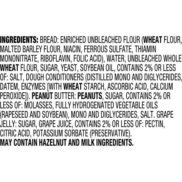 Details Ingredients Bread: Enriched Unbleached Flour (Wheat Flour, Malted Barley Flour, Niacin, Ferrous Sulfate, Thiamin Mononitrate, Riboflavin, Folic Acid), Water, Unbleached Whole Wheat Flour, Sugar, Yeast, Soybean Oil, Contains 2% or Less of: Salt, Dough Conditioners (Distilled Mono and Diglycerides, DATEM, Enzymes [with Wheat Starch, Ascorbic Acid, Calcium Peroxide]). Peanut Butter: Peanuts, Sugar, Contains 2% or Less of: Molasses, Fully Hydrogenated Vegetable Oils (Rapeseed and Soybean), Mono and Diglycerides, Salt. Grape Jelly: Sugar, Grape Juice, Contains 2% or Less of: Pectin, Citric Acid, Potassium Sorbate (Preservative). Show more Product features Enjoy the classic, homemade taste of Smucker’s® Concord Grape Jelly and fresh-roasted Peanut Butter in a new way. Wherever you are, just thaw, unwrap, and enjoy. Perfect "grab-and-go" sandwich Homemade goodness of a peanut butter and jelly sandwich… without the crust! No high fructose corn syrup Special Features Great for lunchtime, snack time, road trips, hiking or any On-The-Go activities Net Quantity of Content 4.0 X 58 g