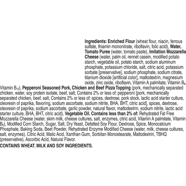 Details Ingredients Enriched Flour (Wheat Flour, Niacin, Ferrous Sulfate, Thiamin Mononitrate, Riboflavin, Folic Acid), Water, Tomato Puree (Water, Tomato Paste), Imitation Mozzarella Cheese (Water, Palm Oil, Rennet Casein, Modified Potato Starch, Vegetable Oil, Potato Starch, Sodium Aluminum Phosphate, Potassium Chloride, Salt, Citric Acid, Potassium Sorbate [Preservative], Sodium Phosphate, Sodium Citrate, Titanium Dioxide [Artificial Color], Maltodextrin, Magnesium Oxide, Zinc Oxide, Riboflavin, Vitamin A Palmitate, Vitamin B6, Vitamin B12), Pepperoni Seasoned Pork, Chicken and Beef Pizza Topping (Pork, Mechanically Separated Chicken, Water, Soy Protein Isolate, Beef, Salt, Contains 2% or Less of: Pepperoni [Pork, Mechanically Separated Chicken, Beef, Salt, Contains 2% or Less of: Spices, Dextrose, Pork Stock, Lactic Acid Starter Culture, Oleoresin of Paprika, Flavoring, Sodium Ascorbate, Sodium Nitrite, BHA, BHT, Citric Acid], Spices, Dextrose, Oleoresin of Paprika, Sodium Ascorbate, Garlic Powder, Natural Flavor, Maltodextrin, Sodium Nitrite, Lactic Acid Starter Culture, BHA, BHT, Citric Acid), Vegetable Oil, Contains Less than 2% of: Rehydrated Fat Free Mozzarella Cheese (Water, Skim Milk, Cheese Cultures, Salt, Enzymes, Citric Acid, Vitamin A Palmitate, Vitamin B6), Modified Corn Starch, Sugar, Salt, Dry Yeast, Defatted Soy Flour, Dextrose, Spice, Monocalcium Phosphate, Baking Soda, Beet Powder, Rehydrated Enzyme Modified Cheese (Water, Milk, Cheese Cultures, Salt, Enzymes), Citric Acid, Malic Acid, Xanthan Gum, Sorbitan Monostearate, Maltodextrin, TBHQ (Preservative), Ascorbic Acid, Natural Flavor. Show more Product features A unique crust that is flakier and crispier than baked crusts. Totino's pizza is the perfect shape for toaster oven preparation or Totino's pizza is the perfect shape for toaster oven preparation! Your favorite classic, affordable, "to share or not to share?" frozen pizza Totino's pizza is the perfect shape for toaster oven preparation A unique crust that is flakier and crispier than baked crusts Conveniently fit two Totino's pizzas on a baking sheet Available in a number of varieties, including cheese, pepperoni, and combination Net Quantity of Content 2 X 145.0