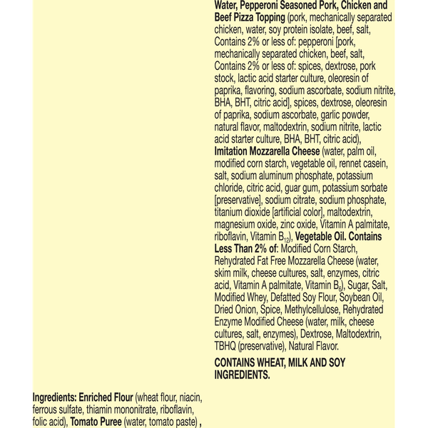 Details Ingredients Enriched Flour (Wheat Flour, Niacin, Ferrous Sulfate, Thiamin Mononitrate, Riboflavin, Folic Acid), Tomato Puree (Water, Tomato Paste), Water, Pepperoni Seasoned Pork, Chicken and Beef Pizza Topping (Pork, Mechanically Separated Chicken, Water, Soy Protein Isolate, Beef, Salt, Contains 2% or Less of: Pepperoni [Pork, Mechanically Separated Chicken, Beef, Salt, Contains 2% or Less of: Spices, Dextrose, Pork Stock, Lactic Acid Starter Culture, Oleoresin of Paprika, Flavoring, Sodium Ascorbate, Sodium Nitrite, BHA, BHT, Citric Acid], Spices, Dextrose, Oleoresin of Paprika, Sodium Ascorbate, Garlic Powder, Natural Flavor, Maltodextrin, Sodium Nitrite, Lactic Acid Starter Culture, BHA, BHT, Citric Acid), Imitation Mozzarella Cheese (Water, Palm Oil, Modified Corn Starch, Vegetable Oil, Rennet Casein, Salt, Sodium Aluminum Phosphate, Potassium Chloride, Citric Acid, Guar Gum, Potassium Sorbate [Preservative], Sodium Citrate, Sodium Phosphate, Titanium Dioxide [Artificial Color], Maltodextrin, Magnesium Oxide, Zinc Oxide, Vitamin A Palmitate, Riboflavin, Vitamin B12), Vegetable Oil, Contains Less than 2% of: Modified Corn Starch, Rehydrated Fat Free Mozzarella Cheese (Water, Skim Milk, Cheese Cultures, Salt, Enzymes, Citric Acid, Vitamin A Palmitate, Vitamin B6), Sugar, Salt, Modified Whey, Defatted Soy Flour, Soybean Oil, Dried Onion, Spice, Methylcellulose, Rehydrated Enzyme Modified Cheese (Water, Milk, Cheese Cultures, Salt, Enzymes), Dextrose, Maltodextrin, TBHQ (Preservative), Natural Flavor. Show more Product features Pepperoni Pizza in a crispy, golden, snackable crust. Pizza Rolls are easy to make and only take 60 seconds in the microwave. PIZZA ROLLS: A pizza in a crispy, golden, snackable crust QUICK AND EASY: Pizza Rolls are easy to make and only take 60 seconds in the microwave, go from Zero to Pizza Pronto CROWD PLEASER: A crowd-pleasing snack for parties or snack time and delicious on their own or paired with homemade dips TRY THEM ALL: Available in a number of varieties, including cheese, pepperoni, and combination Available in a number of varieties, including cheese, pepperoni, and combination Special Features Pepperoni made with pork, chicken, beef Net Quantity of Content ABOUT 15 X 6 rolls (85g)