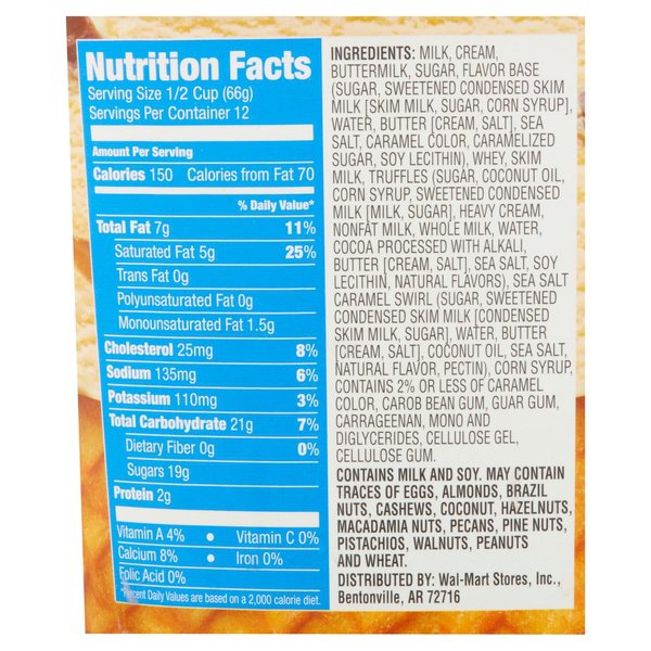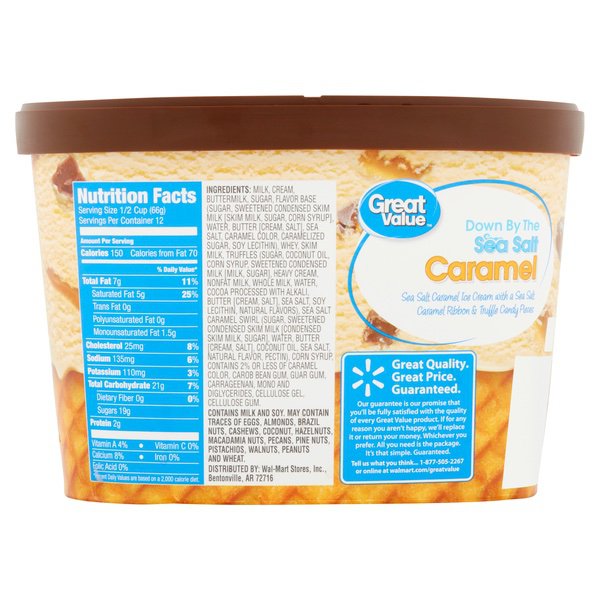 Details Ingredients MILK, CREAM, BUTTERMILK, SUGAR, FLAVOR BASE (SUGAR, SWEETENED CONDENSED SKIM MILK [SKIM MILK, SUGAR, CORN SYRUP], WATER, BUTTER [CREAM, SALT], SEA SALT, CARAMEL COLOR, CARAMELIZED SUGAR, SOY LECITHIN), WHEY, TRUFFLE CANDY PIECES (SUGAR, COCONUT OIL, CORN SYRUP, SWEETENED CONDENSED MILK [MILK, SUGAR], HEAVY CREAM, NONFAT MILK, WHOLE MILK, WATER, COCOA PROCESSED WITH ALKALI, BUTTER [CREAM, SALT], SEA SALT, SOY LECITHIN, NATURAL FLAVORS), SEA SALT CARAMEL SWIRL (SUGAR, SWEETENED CONDENSED SKIM MILK [CONDENSED SKIM MILK, SUGAR], WATER, BUTTER [CREAM, SALT], COCONUT OIL, SEA SALT, NATURAL FLAVOR, PECTIN), CORN SYRUP, SKIM MILK, CONTAINS 1% OR LESS OF CAROB BEAN GUM, GUAR GUM, CARRAGEENAN, MONO AND DIGLYCERIDES, CELLULOSE GEL, CELLULOSE GUM, CARAMEL COLOR. Show more Product features Great Value Down By The Sea Salt Caramel Ice Cream is a classically delicious dessert that is a fun treat for kids and adults alike. This delightful treat features sea salt caramel ice cream with a sea salt caramel ribbon and truffle candy pieces. Indulge in this sweet treat straight from the tub or scoop into a waffle cone or ice cream bowl. Enjoy it as is or top with sprinkles, chocolate syrup, almonds, whipped cream and a maraschino cherry. This ice cream is also perfect for homemade milkshakes and smoothies. It comes with three pounds of ice cream, making it easy to stock up. Put a smile on your loved ones face with a scoop of Great Value Down By The Sea Salt Caramel Ice Cream. Great Value products provide families with affordable, high-quality grocery and household consumable options. With our wide range of product categories spanning grocery and household consumables, we offer you a variety of products for your family's needs. Our products are conveniently available online and in Walmart stores nationwide, allowing you to stock up and save money at the same time. Great Value Down By The Sea Salt Caramel Ice Cream, 48 oz: Sea salt caramel ice cream with a sea salt caramel ribbon and truffle candy pieces Enjoy in a waffle cone or straight from the tub Top with sprinkles, chocolate syrup, almonds, whipped cream or a maraschino cherry Perfect for homemade milkshakes Special Features No Net Quantity of Content 9 X 2/3 cup