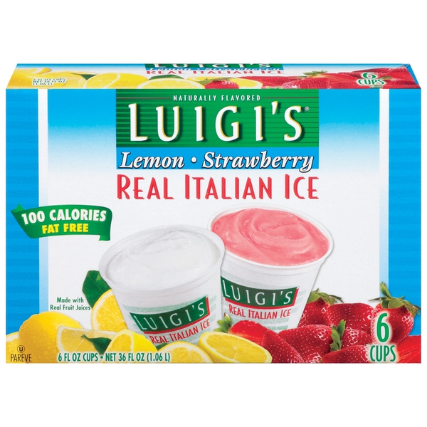 Details Ingredients LEMON INGREDIENTS: MICRON FILTERED WATER, SUGAR, CORN SYRUP, CITRIC ACID, LEMON JUICE CONCENTRATE, NATURAL FLAVOR, GUAR AND XANTHAN GUMS. STRAWBERRY INGREDIENTS: MICRON FILTERED WATER, SUGAR, CORN SYRUP, NATURAL FLAVOR, STRAWBERRY JUICE CONCENTRATE, CITRIC ACID, GUAR AND XANTHAN GUMS, BEET JUICE CONCENTRATE (FOR COLOR), AND CARAMEL (FOR COLOR). Show more Product features This Luigi's Strawberry Real Italian Ice 6-Count is a delightful treat to enjoy during just about any type of occasion. It's the nation's leader in Italian Ice, and it's made with real fruit juice and no high-fructose corn syrup. Available in a variety of 12 flavors, Luigi's frozen Italian ice is sure to satisfy every member of your home. At only 100 calories, it provides you with the ideal alternative to a high-calorie dessert. The lemon and strawberry flavors have no top allergen-containing ingredients and are made on a peanut-, tree nut-, dairy-, gluten- and egg-free line. This Luigi's Strawberry Real Italian Ice 6-count comes in a 6-oz container. It contains no saturated fat, trans fat or cholesterol and is low in sodium. Luigi's Lemon and Strawberry Real Italian Ice: 6-oz cups Naturally flavored Made with real fruit juice 100 calories Fat free Kosher Luigi's lemon real Italian ice contains no high-fructose corn syrup Contains no cholesterol Low in sodium Free of allergen-containing ingredients Made on a peanut-, tree nut-, dairy-, gluten- and egg-free line Special Features Cholesterol free Net Quantity of Content 6 X 1 cup (6 floz/177 mL)