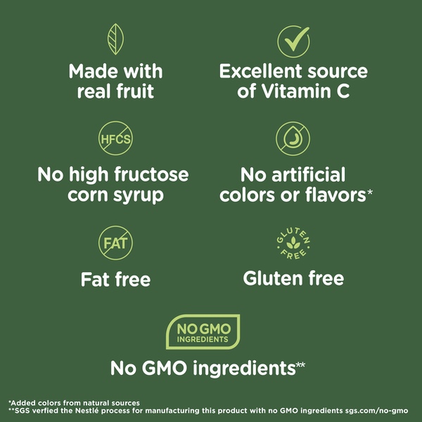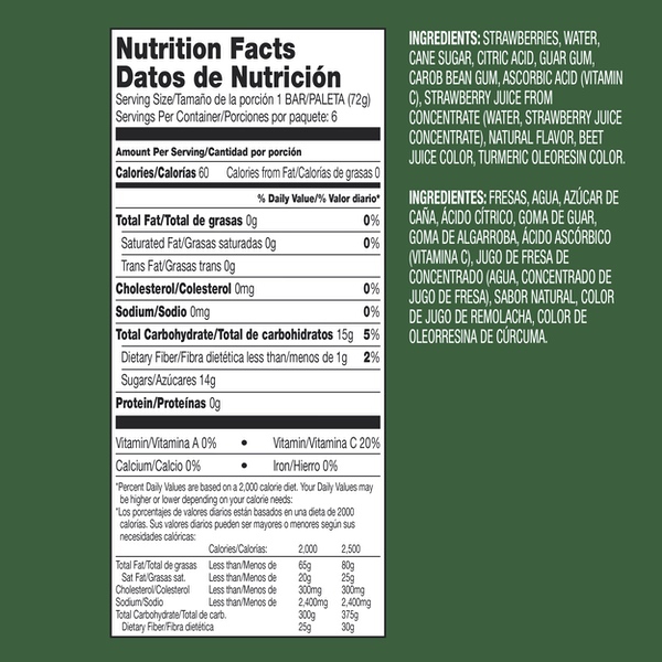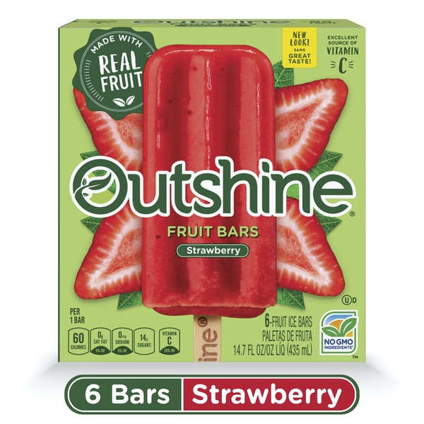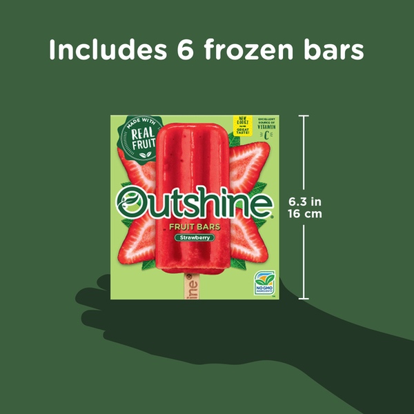 Details Ingredients Strawberries, Water, Cane Sugar, Citric Acid, Guar Gum, Carob Bean Gum, Ascorbic Acid (Vitamin C), Strawberry Juice from Concentrate (Water, Strawberry Juice Concentrate), Natural Flavor, Beet Juice Color, Turmeric Oleoresin Color. Show more Product features OUTSHINE Strawberry Frozen Fruit Bars are one of the tastiest ways to refresh your day. Our strawberry fruit bars are made with real, honest-to-goodness fruit. They are also gluten and fat free, have no GMO ingredients,* do not contain high fructose corn syrup or artificial colors or flavors.** The bars are transported using a chilled shipping method to arrive frozen and ready to enjoy. These feel-good, healthy snacks are the perfect way to snack and shine. *SGS verified the Nestlé process for manufacturing this product with no GMO ingredients sgs.com/no-gmo. **Added colors from natural sources. OUTSHINE Strawberry Frozen Fruit Bars box contains 6 great-tasting frozen bars Made with real fruit, these fruit bars are an excellent source of Vitamin C These frozen fruit bars featuring real strawberry as the first ingredient are so berry delicious and make a great healthy snack Our frozen fruit bars are gluten free and fat free, have no GMO ingredients,* do not contain high fructose corn syrup or artificial colors or flavors** OUTSHINE is transported using a chilled shipping method to arrive frozen Special Features Made with real fruit Net Quantity of Content 6.0 X 1 Bar (72g)