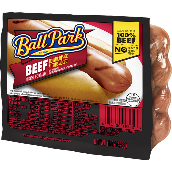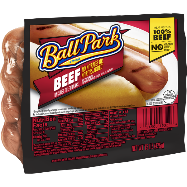 Details Ingredients BEEF, WATER, CORN SYRUP, CONTAINS 2% OR LESS: SALT, POTASSIUM LACTATE, HYDROLYZED BEEF STOCK, SODIUM PHOSPHATE, CELERY JUICE POWDER, NATURAL FLAVOR, SEA SALT, SODIUM DIACETATE, EXTRACTIVES OF PAPRIKA. Show more Product features Taste how 100% Beef turns a great hot dog into a grill-worthy masterpiece. Ball Park® Original Length Beef Hot Dogs are made with 100% beef and no added nitrites or nitrates*, no by-products or fillers, and no artificial flavors or color. Each pack includes 8 hot dogs. Ball Park® Brand was born on a warm summer's day at Detroit Tiger's Stadium in 1957. Maybe that's why Ball Park® Brand and summer go hand-in-hand. Over 60 years later, they're not just burgers and hot dogs, they're a summer tradition. Whether it's the roar of the stadium, the sizzle of the grill, or the smell of the backyard cookout, there's something about Ball Park® Brand that just tastes likes summer, no matter what the season. So fire up the grill, invite over family and friends, and Bring On Summer™ with Ball Park® Brand. *Except those naturally occurring in sea salt and celery juice powder One pack of 8 Original Length Beef Hot DogsMade with 100% BeefNo added nitrites or nitrates, except for those naturally occurring in sea salt and celery juice powderNo by-products or fillersNo artificial colors or flavorsPerfect for cookouts and barbecuesBring On Summer™ with Ball Park® Brand Net Quantity of Content 8 X 53 g