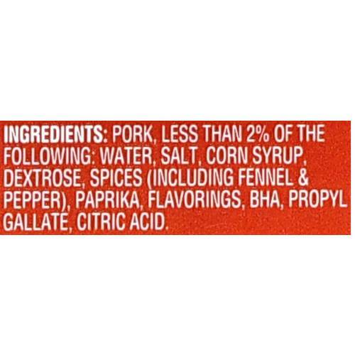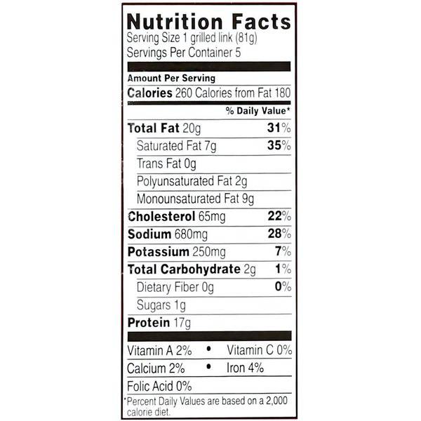 Details Ingredients PORK, LESS THAN 2% OF THE FOLLOWING: WATER, SALT, CORN SYRUP, DEXTROSE, SPICES (INCLUDING FENNEL & PEPPER), PAPRIKA, FLAVORINGS, BHA, PROPYL GALLATE, CITRIC ACID. Show more Product features Great Value Mild Italian Sausage is made fresh with pork and the finest traditional spices without any fillers, preservatives or MSG. These sausages are made with the finest cuts of fresh pork. It is gluten-free delivering the taste and nutrition you want from a sausage without any harmful additives. With easy cooking instructions on the pack, these delicious sausages can be prepared in minutes. They are excellent on the grill and taste great with bell peppers and white onions. Grill, slice and serve them in a sandwich, your favorite salad or on their own. Enjoy the flavor and satisfaction of authentic Italian sausage in every bite with Great Value Mild Italian Sausage. Great Value products provide families with affordable, high quality grocery and household consumable options. With our wide range of product categories spanning grocery and household consumables, we offer you a variety of products for your family’s needs. Our products are conveniently available online and in Walmart stores nationwide, allowing you to stock up and save money at the same time. Great Value Mild Italian Sausage, 19 oz: Made with the finest cuts of pork Great on the grill USDA inspected and approved Perfect to serve guests or at your next party or get-together Net Quantity of Content 5 X 1 Grilled Link (81g)