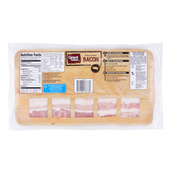 Details Ingredients Pork Cured with: Water, Salt, Sugar, Sodium Phosphates, Sodium Erythorbate, Sodium Nitrite. Product features Great Value Hickory Smoked Original Bacon is all natural bacon cured with a perfect balance of salt and sugar and smoked with hickory that gives it a distinct robust flavor that has been loved for generations. It is gluten-free too making it a great option for individuals who are sensitive to gluten. Whether you like your bacon extra crispy or a bit soft, these premium, all natural Hickory Smoked Original Bacon will have you covered. Enjoy the sweet, hickory smoked taste on its own or added to your favorite dish. Bring home the bacon with Great Value Hickory Smoked Original Bacon.Great Value products provide families with affordable, high quality grocery and household consumable options. With our wide range of product categories spanning grocery and household consumables, we offer you a variety of products for your family's needs. Our products are conveniently available online and in Walmart stores nationwide, allowing you to stock up and save money at the same time. Great Value Original Bacon, Naturally Hickory Smoked, 16 oz Special Features Naturally gluten free food Net Quantity of Content 10 X 15 g