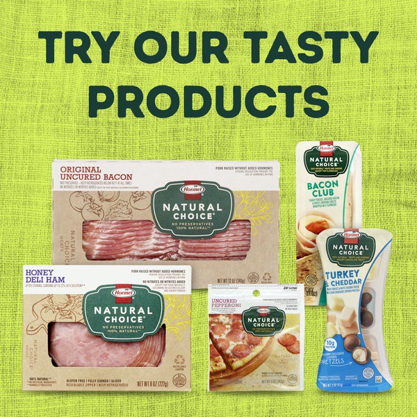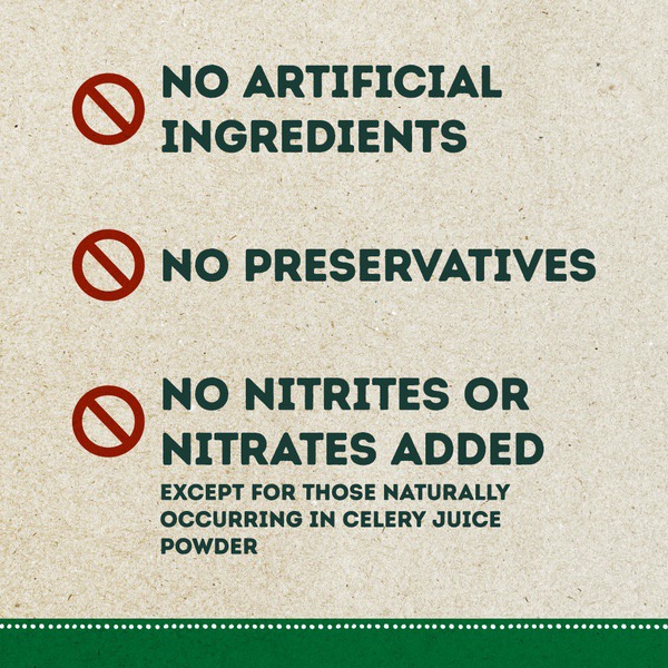 Details Ingredients PORK, WATER, SALT, TURBINADO SUGAR, SEASONING (CULTURED CELERY JUICE POWDER, SEA SALT). Product features Experience The Uncompromising Flavor Of Natural Choice Uncured Bacon. Our Juicy Pork Is Raised Without Any Added Hormones. Yup, That’S Right—Zero. You Can Feel Good About Stacking Those Thick And Meaty Slices High For A Tasty Treat That Satisfies. Make The Natural Choice. Natural Choice Is A Trademark Of Jennie-O Turkey Store, Llc. Made with minimally processed, all natural porkPork raised without added hormones; federal regulations prohibit the use of hormones in pork6 grams of protein and 100 calories per cooked servingNo added nitrates or nitrites except for those naturally occurring in celery and cherry powderGluten free; no artificial ingredients Net Quantity of Content ABOUT 6 X 20 g