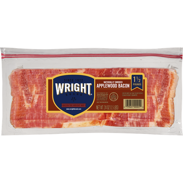 Details Ingredients Cured with water, salt, sugar, sodium phosphate, sodium erythorbate, sodium nitrite. Product features The uncompromising flavor of Wright Brand® Applewood Smoked Bacon doesn't come easy. Hand selected pork belly is trimmed into thick marbled slices, then cured with our 90-year-old recipe and smoked over real applewood chips for a smoky and slightly sweet aroma you can count on. For peak flavor, simply lay bacon slices flat on a cookie sheet and bake at 350⁰F for 15-20 minutes or until crispy and golden brown. To serve, cook up bacon with eggs, peppers, onions and cheese for a hearty breakfast skillet. Includes one 1.5 lb. package of Thick Sliced Applewood Smoked Bacon. This country has a history of making great things. A tradition of working hard, not cutting corners and taking the time to do it right. At Wright® Brand, we still believe in this tradition. We know if you want to make a better bacon, there's only one way to do it: hand selected, hand trimmed, and smoked over real wood chips. That's Bacon the Wright Way™. One 1.5 lb. package of Applewood Smoked BaconNaturally wood smoked over applewood chipsHand selected and hand trimmedThicker, fuller-flavored slices of baconCured with our 90-year-old recipe for rich flavorPackaged in a resealable bagBake at 350⁰F for 15-20 minutes or until crispy and golden brownA great addition with any hearty breakfast Special Features Sliced applewood smoked bacon Net Quantity of Content 18.0 X 14 g
