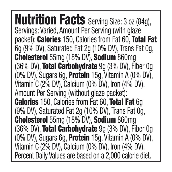 Details Ingredients Cured With: Water, Dextrose, Salt, Potassium Lactate, Corn Syrup, Sodium Phosphates, Brown Sugar, Sodium Diacetate, Sodium Erythorbate, Sodium Nitrite. Honey And Spice Glaze Ingredients: Sugar, Honey Granules,(Refinery Syrup, Hone), Molasses Powder (Refinery Syrup, Molasses), Spices, Salt, Natural Flavors. Show more Product features This Sam’s Choice Smoked Double-Glazed Brown Sugar Spiral Sliced Ham makes an ideal addition to your kitchen for quick and easy meals. It's sliced and ready to put on your sandwich, eat alone or pair with your favorite sides and sauces for a delicious and tasty meal for the whole family to enjoy. It's also a wonderful choice for Easter, Christmas or any holiday dinner and is ready to be the centerpiece of your table today. Sam's Choice Smoked Double Glazed Brown Sugar Spiral Sliced Ham, 2.5-4.5 lbs: Sliced ham Sam’s Choice spiral cut double-glazed for quick and easy meal Double glazed Ideal for holiday dinners or special occasions Fully cooked with delicious flavor Special Features Premium smoked