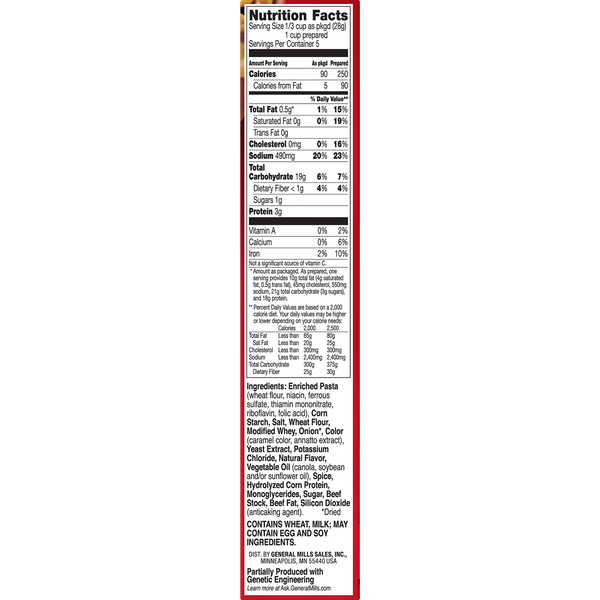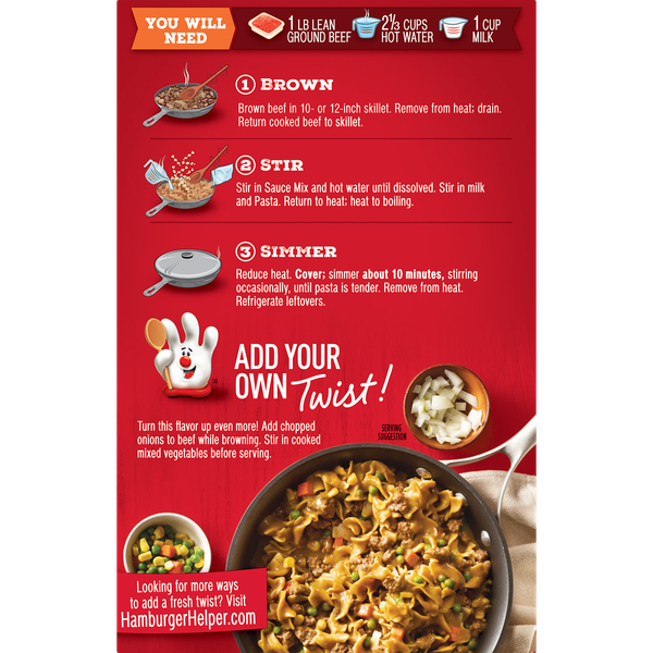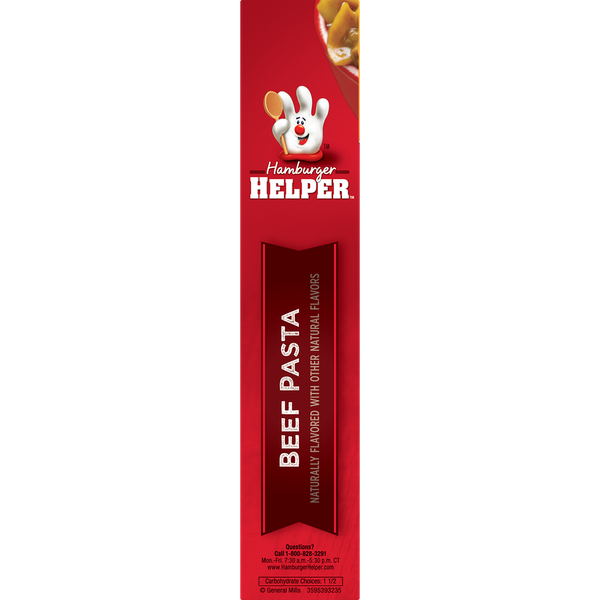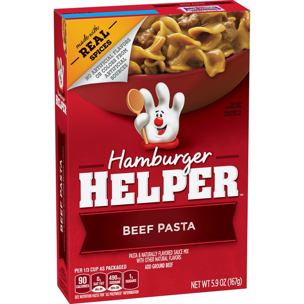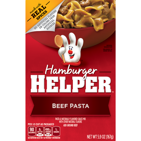 Details Ingredients Enriched Pasta (Wheat Flour, Niacin, Ferrous Sulfate, Thiamin Mononitrate, Riboflavin, Folic Acid), Corn Starch, Salt, Wheat Flour, Modified Whey, Onion*, Color (Caramel Color, Annatto Extract), Hydrolyzed Corn Protein, Potassium Chloride, Yeast Extract, Natural Flavor, Vegetable Oil (Canola, Soybean and/or Sunflower Oil), Spice, Monoglycerides, Soy Sauce* (Soybeans, Wheat, Salt), Mushroom*, Hydrolyzed Soy and Wheat Protein, Sugar, Garlic*, Soybean Oil, Silicon Dioxide (Anticaking Agent).*Dried. Show more Product features Beef Pasta Hamburger Helper is made with REAL spices for the flavors you love most. Our products are made with NO artificial flavors or colors from artificial sources. Add Your Own Twist! Turn this flavor up even more! Add chopped onions to beef just before simmering. Stir in cooked mixed vegetables before serving. DRY MEAL MIX: America's favorite Hamburger Helper in a delicious beef pasta entrée, blending pasta, sauce and real spices INGREDIENTS: Packaged food is made with real spices and no artificial flavors or colors from artificial sources QUICK AND EASY: Make Hamburger Helper in three easy steps; simply brown beef, stir in ingredients and pasta sauce and simmer ENDLESS OPTIONS: Add your own twist with additional ingredients and head to the Betty Crocker website for Hamburger Helper recipes and pastas the whole family will love BOX CONTAINS: One pack of Hamburger Helper meals, 5.9 oz box; an everyday pantry staple Meal Kit, Dry Dinner Kit, One Skillet Meal, Helpers, Hamburger Helper, Packaged Meal Net Quantity of Content 5 X 1 cup prepared