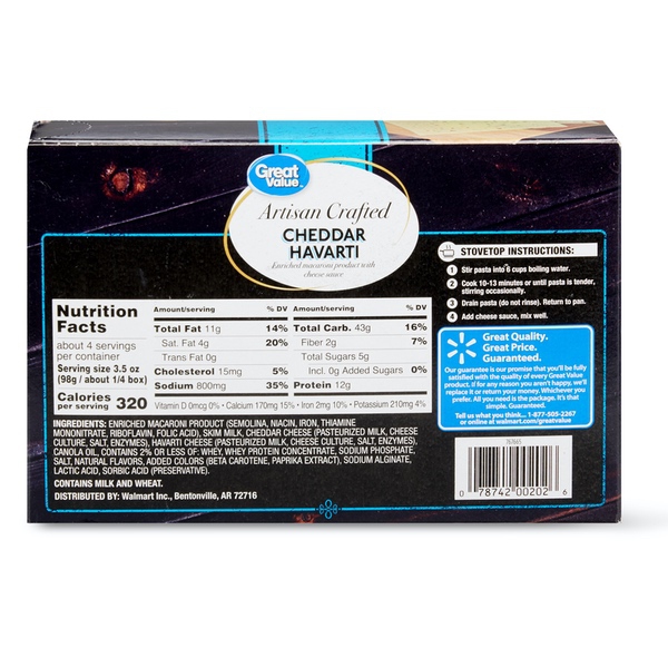 Details Ingredients ENRICHED MACARONI PRODUCT (SEMOLINA, NIACIN, IRON, THIAMINE MONONITRATE, RIBOFLAVIN, FOLIC ACID), SKIM MILK, CHEDDAR CHEESE (PASTEURIZED MILK, CHEESE CULTURE, SALT, ENZYMES), HAVARTI CHEESE (PASTEURIZED MILK, CHEESE CULTURE, SALT, ENZYMES), CANOLA OIL, CONTAINS 2% OF LESS OF: WHEY, WHEY PROTEIN CONCENTRATE, SODIUM PHOSPHATE, SALT, NATURAL FLAVORS, ADDED COLORS (BETA CAROTENE, PAPRIKA EXTRACT), SODIUM ALGINATE, LACTIC ACID, SORBIC ACID (PRESERVATIVE). Show more Product features Great Value Artisan Crafted Havarti Cheddar Macaroni & Cheese is a perfect quick and easy dinner the whole family will love. This dish features enriched macaroni & cheese with a delicious Havarti cheddar flavored cheese sauce. Simply bowl six cups of water on the stovetop and boil the pasta for 10-13 minutes, then drain and mix in the yummy cheese sauce and you have dinner for the whole family. You can also try adding your favorite veggies and proteins to make the meal your own! Or, try pairing with a protein of your choice, fresh salad, and dinner rolls for a hearty full meal. Bring home the Artisan Crafted Havarti Cheddar Macaroni & Cheese for dinner today! Great Value products provide families with affordable, high-quality grocery and household consumable options. With our wide range of product categories spanning grocery and household consumables, we offer you a variety of products for your family's needs. Our products are conveniently available online and in Walmart stores nationwide, allowing you to stock up and save money at the same time. Great Value Artisan Crafted Havarti Cheddar Macaroni & Cheese, 12 oz: Cooks in just 10-13 minutes 4 servings per container No artifical flavors Delicious meal for the whole family Net Quantity of Content ABOUT 4 X 3.5 oz