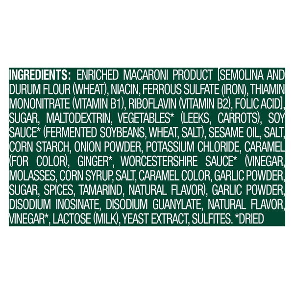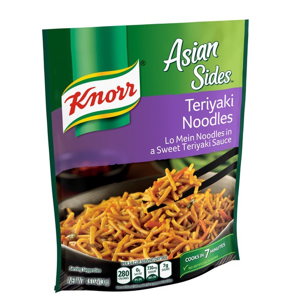Details Ingredients ENRICHED MACARONI PRODUCT [SEMOLINA AND DURUM FLOUR (WHEAT), NIACIN, FERROUS SULFATE (IRON), THIAMIN MONONITRATE (VITAMIN B1), RIBOFLAVIN (VITAMIN B2), FOLIC ACID], SUGAR, MALTODEXTRIN, VEGETABLES* (LEEKS, CARROTS), SOY SAUCE* (FERMENTED SOYBEANS, WHEAT, SALT), SESAME OIL, SALT, CORN STARCH, ONION POWDER, POTASSIUM CHLORIDE, CARAMEL (FOR COLOR), GINGER*, WORCESTERSHIRE SAUCE* (VINEGAR, MOLASSES, CORN SYRUP, SALT, CARAMEL COLOR, GARLIC POWDER, SUGAR, SPICES, TAMARIND, NATURAL FLAVOR), GARLIC POWDER, DISODIUM INOSINATE, DISODIUM GUANYLATE, NATURAL FLAVOR, VINEGAR*, LACTOSE (MILK), YEAST EXTRACT, SULFITES. Show more Product features Treat your taste buds with Knorr Asian Sides Teriyaki Noodles (4.6oz). Our Asian noodle side dish expertly combines mixed vegetables with the sweet flavor of teriyaki sauce. Our deliciously seasoned Asian noodle dish recipes are great as part of a delicious main dish or as a standalone side dish. Make Knorr Pasta Sides the foundation of a crowd-pleasing dinner. Your family is sure to love the teriyaki flavor of Knorr Asian Sides Teriyaki Noodles (4.6oz). On top of tasting delicious, our Asian noodle dish is quick and easy to prepare. The Asian noodles cook in just seven minutes on the stovetop or microwave. Knorr Rice Sides have no artificial flavors making it an excellent choice for creating a family-favorite meal. Use Knorr Sides to create a mouth-watering main dish. Simply prepare Knorr Asian Sides and add your favorite meat and vegetables to make a dinner your family is sure to love. You can find great recipes from Knorr like our chef-inspired Asian Shrimp & Peanut Stir-Fry -- simply add shrimp, eggs, peanuts, and carrots. Discover more quick and delicious dinner ideas at Knorr.com. There are hundreds of recipes to help you find dinner inspiration. Knorr also has Rice Sides, Pasta Sides, Fiesta Sides and more. Knorr offers more than 40 varieties of rice and pasta sides so you can be sure to find flavors your family will love. Knorr believes that good food matters and everyday meals can be just as magical as special occasions. Knorr products owe their taste and flavors to the culinary skills and passion of our chefs. Knorr sources high-quality ingredients to create delicious side dishes, bouillons, sauces, gravies, soups and seasonings enjoyed by families everywhere. Knorr Asian Pasta Side Dish Teriyaki Noodles 4.6 oz Knorr Asian Sides Teriyaki Noodles (4.6oz) is a pasta side dish that enhances meals with amazing flavor Teriyaki Noodles Asian Sides expertly combines noodles and mixed vegetables with the sweet flavor of teriyaki sauce No artificial flavors Quick and easy to prepare - Cooks in 7 minutes Stovetop or microwave cooking Perfect as an ingredient in a delicious Knorr recipe or as a side dish Special Features 0G trans fat Net Quantity of Content about 2 X 3/4 cup