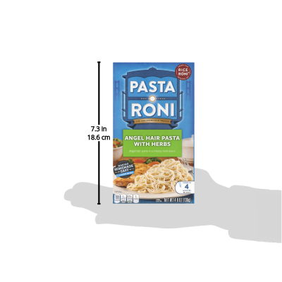 Details Ingredients Wheat Flour, Whey, Salt, Palm Oil, Corn Maltodextrin, Corn Syrup Solids, Natural Flavor, Onions*, Monosodium Glutamate, Parsley*, Garlic, Sodium Caseinate, Potassium Phosphate, Rosemary, Soy Lecithin, Sunflower Oil, Sage, Niacinamide, Ferrous Sulfate, Yellow 5, Yellow 6 Lake, Celery*, Thiamin Mononitrate, Riboflavin, Folic Acid.*Dried. Show more Product features Pasta Roni Angel Hair Pasta with Herbs. This is a angel hair pasta in a creamy herb sauce. It cooks in 4 minutes and no draining needed. Pasta Roni Angel Hair Pasta with Herbs. Pasta Roni Angel Hair Pasta with Herbs. Est 1958. The San Francisco Treat. From the makers of Rice Roni. Angel hair pasta in a creamy herb sauce. Making homemade easy. Cooks in 4 minutes. No drain! Per serving: 190 Calories. 1g Sat fat, 5% DV. 620mg Sodium, 26% DV. 2g Sugars. Net Wt 4.8 oz (136 g). Fat reduced to 5g from 13g per serving. Saturated fat reduced to 1.5g from 3.5g per serving. Trans fat reduced to 0g from 1.5g per serving. 45 Calories from fat per serving from 120 calories. Try Rice-A-Roni for another easy homemade meal. Rice-A-Roni Chicken. Some settling of contents may have occurred during shipment and handling. howtorecycle.info. Questions or Comments? Please have package available when calling. Call 1-800-421-2444. Visit us www.pastaroni.com. 2016 GGC. Net Quantity of Content 2.5 X 2.0 oz. (56g/about 3/4 inch circle dry pasta & 1 1/3 Tbsp saucemix)