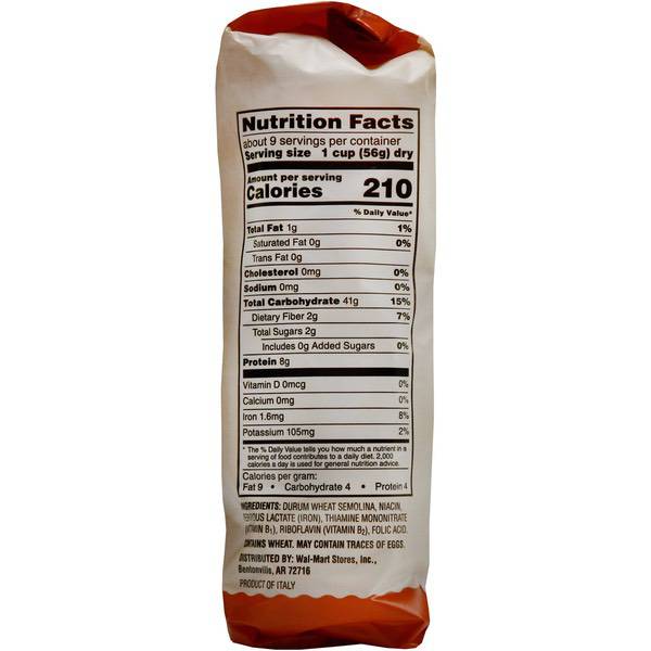 Details Ingredients DURUM WHEAT SEMOLINA, NIACIN, FERROUS LACTATE (IRON), THIAMINE MONONITRATE (VITAMIN B1), RIBOFLAVIN (VITAMIN B2), FOLIC ACID Show more Product features Sam's Choice Italia Rigatoni Pasta offers the world-famous traditional Italian cut in a pasta that is produced with selected high-quality durum wheat. Traditionally made with a rougher, ridged surface, this pasta better absorbs sauces and gives you a classic feel and more delicious pasta dish. Made with a recipe passed down for generations, this pasta delivers authentic taste that is quick and easy to prepare. This pasta is the perfect canvas for traditional Italian recipes or for creating your own culinary masterpieces. For a quick and easy dinner, simply pair with the protein and veggies of your choice and garnish with garlic and herbs. The possibilities are endless with Sam’s Choice Italia Rigatoni Pasta. Sourced and imported directly from Italy, Sam's Choice Italia brings you the best cuisine that Italy has to offer. Enjoy fine, authentic ingredients, classically delicious recipes, and full flavor in every bite. We offer you a carefully curated assortment that is both innovative and enticing. Sam's Choice products are inspired by our proud heritage and are trusted today by the millions of customers across the world. Sam's Choice Italia Rigatoni Pasta, 17.6 oz: Bronze cut quality Authentic taste, made from recipes passed down for generations Rough, ridged surface absorbs sauces and gives authentic taste and texture 9 servings per bag Net Quantity of Content 9 X 1 Cup (56g) dry