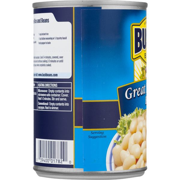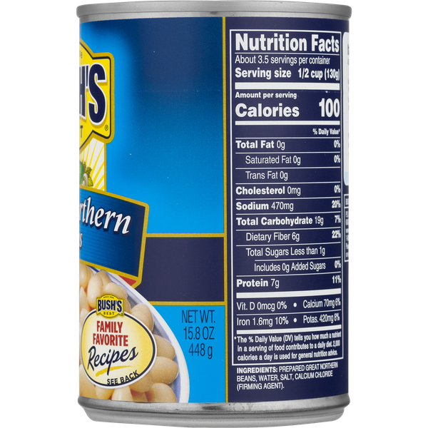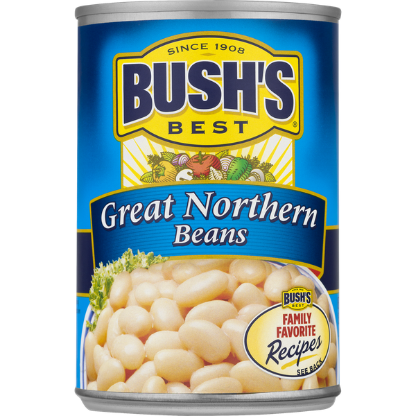 Details Ingredients PREPARED GREAT NORTHERN BEANS, WATER, SALT, CALCIUM CHLORIDE (FIRMING AGENT). Product features BUSH'S® BEST Great Northern Beans. It is gluten free product. Great northern beans thrive in colder temperatures, withstanding whatever Mother Nature throws, snows and blows their way without complaint. so it comes as no surprise that they make such a natural addition to all kinds of comfort foods. Indeed, the mild, delicate flavor of BUSH'S Great Northern Beans is the perfect addition to any soup, stew, dip, cassoulet, sauce and white chili, and they're a reliably delicious side dish in their own right. We'd expect nothing less from such a hardy (and hearty) bean. Try them in Reduced Sodium! Great Northern Beans Since 1908. Special Features Slow cooked To perfection Net Quantity of Content ABOUT 3.5 X 1/2 cup