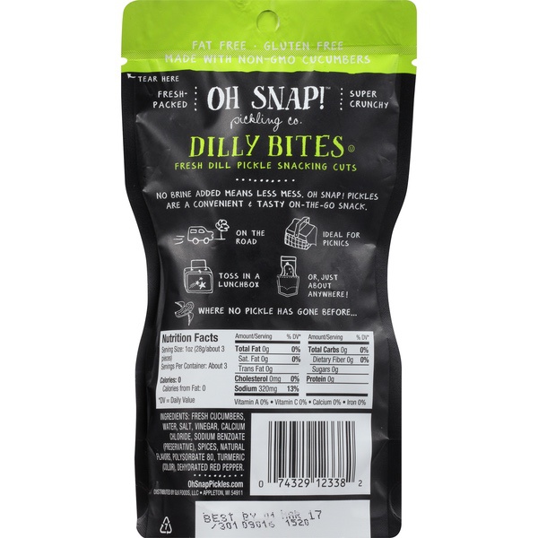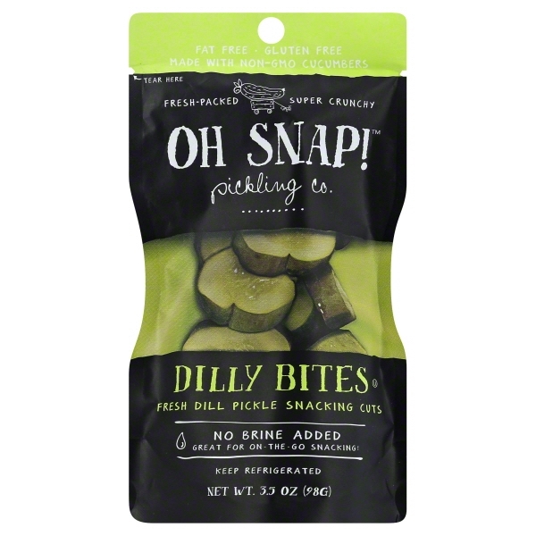 Details Ingredients FRESH CUCUMBERS, WATER, SALT, VINEGAR, CALCIUM CHLORIDE, SODIUM BENZOATE (PRESERVATIVE), SPICES, NATURAL FLAVORS, POLYSORBATE 80, TURMERIC (COLOR), DEHYDRATED RED PEPPER. Show more Product features Enjoy a tasty on-the-go snack with Pickling Co's Oh Snap! Dilly Bites Fresh Dill Pickle Snacking Cuts. This Brineless pickle means no mess. The Oh Snap pickle is free of gluten and GMO, making them a tasty choice that you can enjoy just about anywhere. Take them to picnics or toss some into a lunchbox for work and school. These crunchy pickles are fat-free and available in a convenient 3.5 oz bag. Oh Snap! Pickling Co. Dilly Bites Fresh Dill Pickle Snacking Cuts: Fresh packed Super crunchy Great for on-the-go snacking No brine added Fat-free Gluten-free pickle should be kept refrigerated GMO-free Available in a convenient 3.5 oz bag Net Quantity of Content About 3 X 1 oz