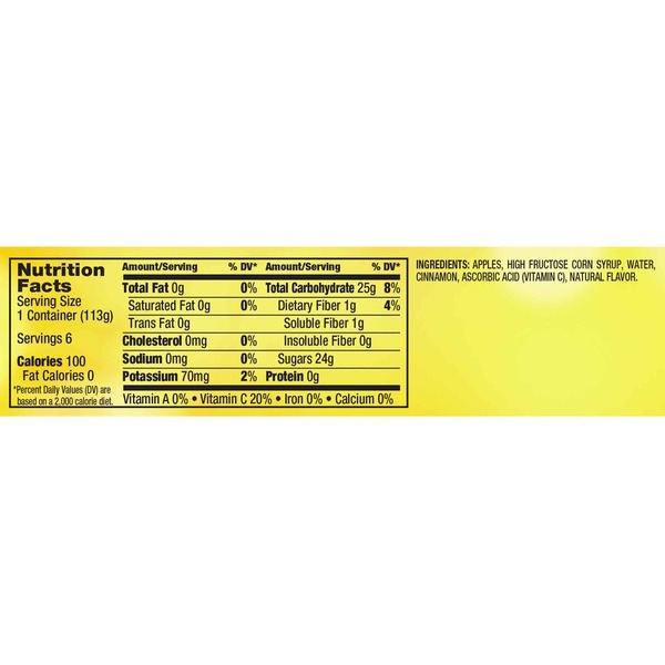 Details Ingredients APPLES, HIGH FRUCTOSE CORN SYRUP, WATER, CINNAMON, ASCORBIC ACID (VITAMIN C), NATURAL FLAVOR Product features Made from ripe apples, Mott’s Cinnamon Applesauce has a touch of cinnamon for added flavor. These convenient 4 ounce cups are a healthier snack alternative and great to pack in lunches. They’re also an excellent source of vitamin C with a delicious taste that kids love. Treat your family to the great taste of Mott’s Cinnamon Applesauce. A healthier snack alternative and great lunchbox addition An excellent source of vitamin C and naturally fat and cholesterol free One 6-count of 4 ounce cups Special Features Heart-healthy Net Quantity of Content 6 X 1 Container (113g)