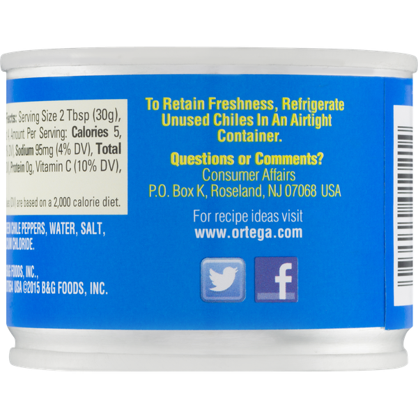 Details Ingredients Green Chiles, Salt, Citric Acid, Calcium Chloride. Product features Ortega Diced Green Chiles available in a 4-oz can are sure to spice up any meal. Ortega has made the original fire-roasted green chile since 1897. These canned green chiles have been fire-roasted for the fullest flavor. Their signature roasting process piques the flavor for an authentic Mexican taste. It contains simple ingredients to add a spicy yet delicious flavor to any traditional dish. Add this to many of your favorite recipes for flavor. Each serving only contains 10 calories. It contains nutrients such as iron, vitamin C and protein to add to a well-balanced diet. Simply stir it in while cooking, and in no time you will have a mouth-watering meal the whole family will enjoy. Each can contains enough to serve at least four people. Ortega Diced Green Chiles, 4 oz: America's favorite Kosher Ortega green chiles Special Features Diced Net Quantity of Content About 4 X 30 g