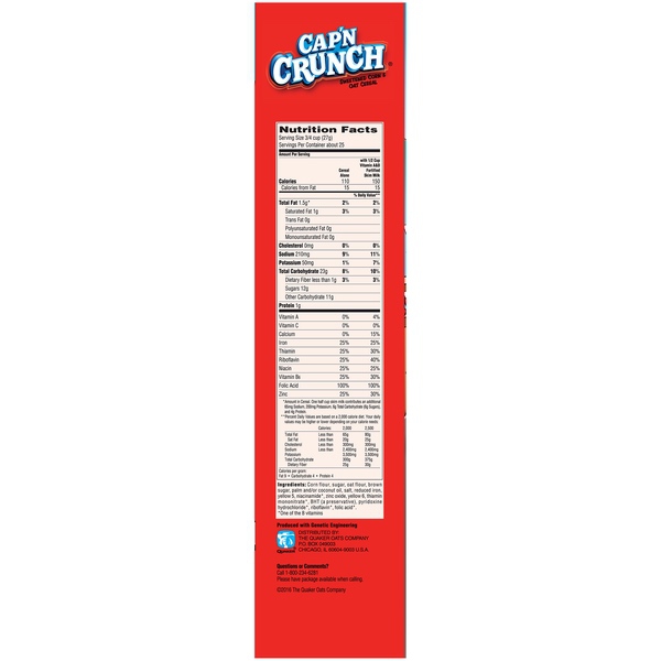 Details Ingredients CORN FLOUR, SUGAR, OAT FLOUR, BROWN SUGAR, PALM AND/OR COCONUT OIL, SALT, REDUCED IRON, YELLOW 5, NIACINAMIDE*, ZINC OXIDE, YELLOW 6, THIAMIN MONONITRATE*, RIBOFLAVIN*, BHT (PRESERVATIVE), PYRIDOXINE HYDROCHLORIDE*, FOLIC ACID*, TOCOPHEROLS (PRESERVATIVE). Show more Product features The original CRUNCH! You’ll start your day with a smile when you enjoy a bowl of this great-tasting, crunchy sweetened corn and oat cereal. Serve it with low-fat milk and fresh fruit or a glass of 100% juice for an easy-to-prepare breakfast. Convenient and easy to prepare. Crunchy sweetened corn and oat cereal. Net Quantity of Content ABOUT 21 X 3/4 cup