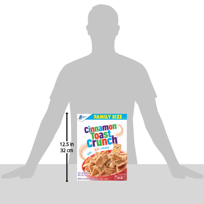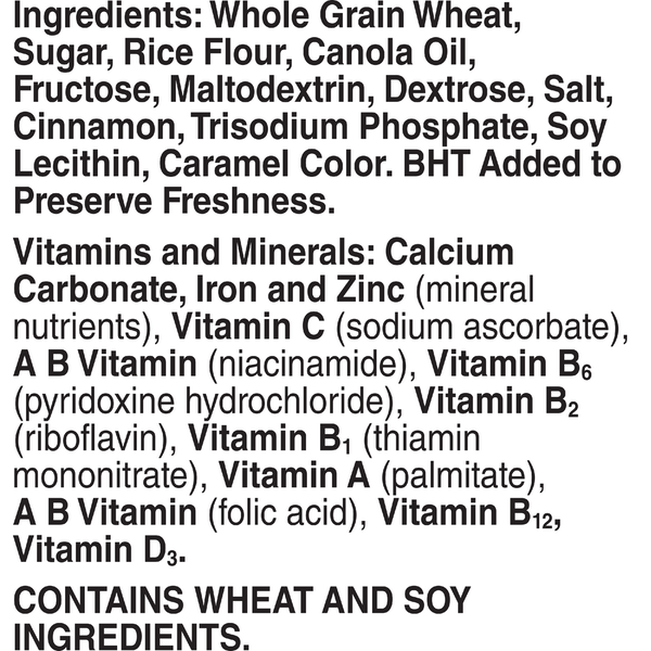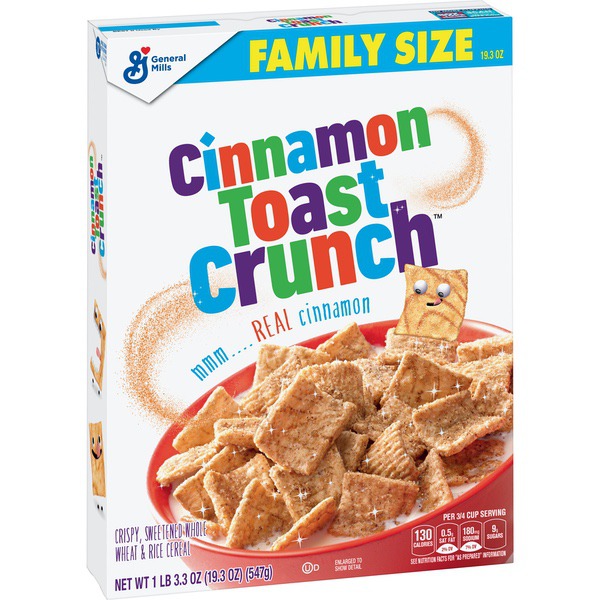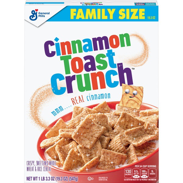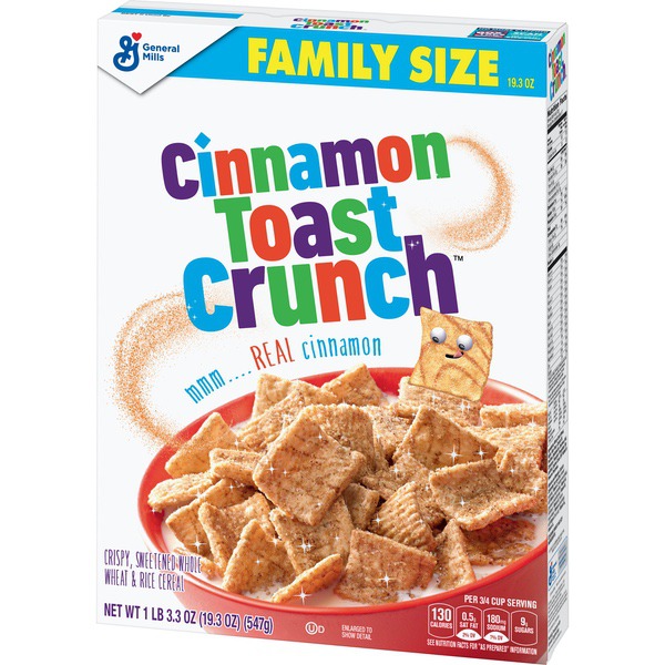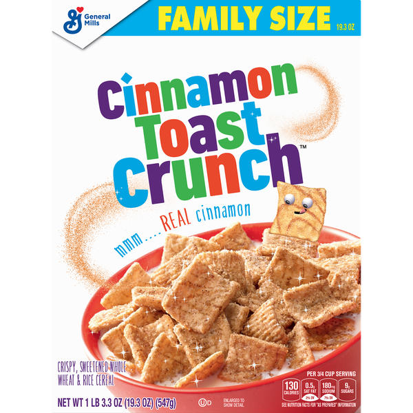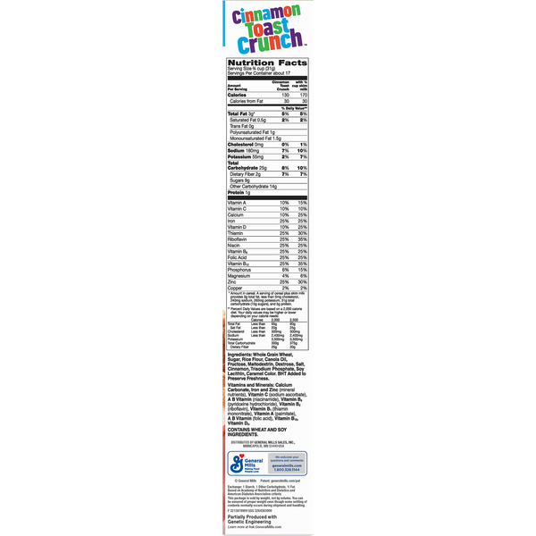 Details Ingredients Whole Grain Wheat, Sugar, Rice Flour, Canola Oil, Fructose, Maltodextrin, Dextrose, Salt, Cinnamon, Trisodium Phosphate, Soy Lecithin, Caramel Color. BHT Added to Preserve Freshness. Show more Product features First Ingredient is Whole Grain (12g whole grain per serving). At least 48g recommended daily A whole grain food is made by using all three parts of the grain. This cereal is packed with nutrients and contains whole grain to help fuel your morning. No high fructose corn syrup. No colors from artificial sources. No artificial flavors. Has 9 grams of sugar per serving. Is a good source of Calcium and Vitamin D. For over 35 years, Cinnamon Toast Crunch has continued to be a favorite for the whole family! Cinnamon Toast Crunch is a ready to eat cereal made with in crispy sweetened whole wheat square cereal pieces, covered in delicious cinnamon and sugar. It maintains a great texture that stays crunchy, even in milk and delivers a irresistible Cinnamilk finish in every bowl. Enjoy Cinnamon Toast Crunch in milk for breakfast or to munch on as a snack throughout the day. Try one of the other delicious varieties of Toast Crunch cereals including: Cinnamon Toast Crunch Churros, Chocolate Toast Crunch and Frosted Toast Crunch. Cinnamon Toast Crunch Cereal is a delicious breakfast cereal for the entire family to enjoy A perfect combination of sweet cinnamon sugar and crunch taste in every bite with a one of a kind cinnamilk finish Enjoy Cinnamon Toast Crunch with milk or by itself at breakfast, as a snack, or whenever Contains whole grains for a well rounded meal KIDS SNACK: A pantry staple for breakfast that's a sweet, crunchy cereal. Enjoy with milk for breakfast or by itself for a school snack Breakfast Cereal; Cold Cereal; Cinnamon Cereal, Box Tops For Education Net Quantity of Content 17 X 3/4 cup (31g)