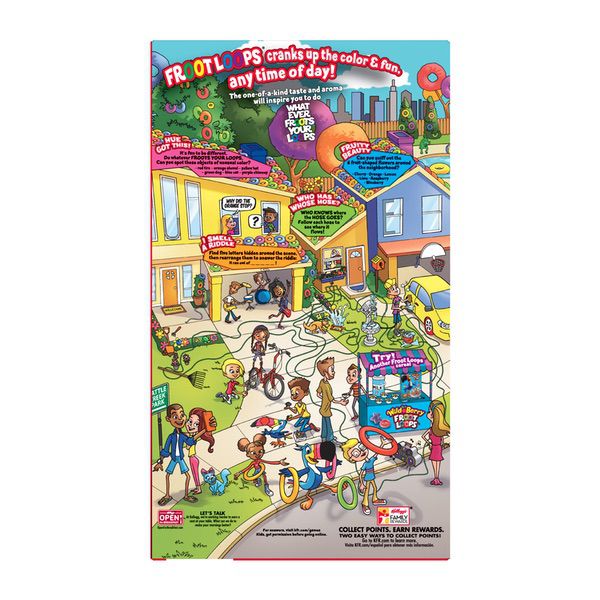 Details Ingredients Ingredients: Corn flour blend (whole grain yellow corn flour, degerminated yellow corn flour), sugar, wheat flour, whole grain oat flour, modified food starch, contains 2% or less of hydrogenated vegetable oil (coconut, soybean and/or cottonseed), oat fiber, salt, soluble corn fiber, natural flavor, red 40, turmeric extract color, blue 1, yellow 6, annatto extract color, BHT for freshness.Vitamins and Minerals: Vitamin C (sodium ascorbate and ascorbic acid), niacinamide, reduced iron, zinc oxide, vitamin B6 (pyridoxine hydrochloride), vitamin B2 (riboflavin), vitamin B1 (thiamin hydrochloride), vitamin A palmitate, folic acid, vitamin B12, vitamin D3. Show more Product features A fun part of any complete breakfast and bursting with fruity flavor, Kellogg’s Froot Loops is a delicious, sweetened cereal made with whole grains. An excellent source of 8 vitamins and minerals and a good source of fiber, Froot Loops is also low in fat. Made to help bring energy to your mornings, our colorful cold cereal makes for a tasty pick-me-up at school or work, as an afternoon bite, or late night treat. A travel-ready food, Kellogg’s Froot Loops are an ideal companion for lunchboxes, after-school snacks, and busy, on-the-go moments. Just add your favorite dairy or nut-milk or enjoy as a crispy treat straight from the box. • Includes 1, 19.4-ounce box of ready-to-eat Froot Loops Cereal; Packaged for freshness and great taste • Bursting with fruity flavor, Kellogg’s Froot Loops is a delicious, sweetened cereal made with whole grains; A fun part of any balanced breakfast • Excellent source of 8 Vitamins and Minerals; Good source of fiber; 11 grams whole grain per serving; Low Fat; Ingredients contain wheat; Corn used in this product may contain traces of soy • A classic, family-favorite cereal that's perfect for both kids and adults; Makes a delicious cold breakfast at home or school, midday bite at work, after-dinner treat, and more • A travel-ready food; Great for backpacks and lunchboxes; Stow some in your tote bag, car, and desk for anytime snacking Net Quantity of Content ABOUT 19 X 29 g