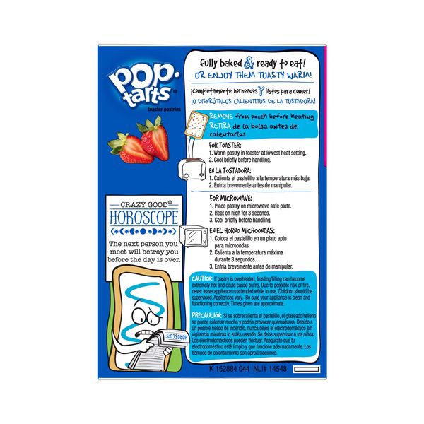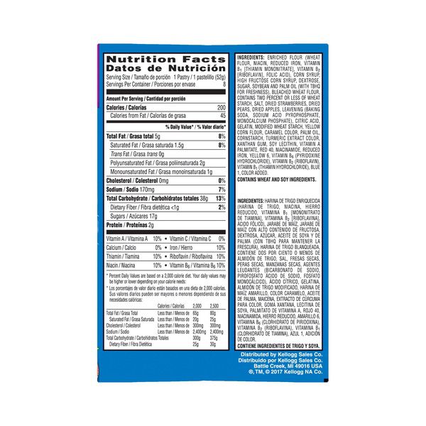 Details Ingredients Enriched flour (wheat flour, niacin, reduced iron, vitamin B1 [thiamin mononitrate], vitamin B2 [riboflavin], folic acid), corn syrup, high fructose corn syrup, dextrose, soybean and palm oil (with TBHQ for freshness), sugar, bleached wheat flour, contains two percent or less of wheat starch, salt, dried strawberries, dried pears, dried apples, leavening (baking soda, sodium acid pyrophosphate, monocalcium phosphate), citric acid, gelatin, modified wheat starch, yellow corn flour, caramel color, palm oil, xanthan gum, cornstarch, turmeric extract color, soy lecithin, red 40, yellow 6, blue 1, color added. Show more Product features Pop-Tarts Frosted Strawberry toaster pastries are a delicious treat to look forward to. Jump-start your day with a sweet, gooey strawberry-flavored filling encased in a crumbly pastry crust and topped with yummy frosting and colorful rainbow sprinkles. A quick and tasty anytime snack for the whole family, Kellogg’s Pop-Tarts toaster pastries are an ideal companion for lunch boxes, after-school snacks, and busy, on-the-go moments. Just pop them in your toaster for a warm, golden crust or enjoy them right out of the pouch with a glass of ice-cold milk. • Soft toaster pastries with the flavor of strawberry and delicious frosting with crunchy rainbow sprinkles; Sweet, fully baked, and ready to eat • Start your day with crumbly pastry crust and strawberry-flavored filling; A delicious, family-favorite morning treat; Great for kids and adults • Contains 0 grams trans fat; A fun part of any balanced breakfast at home or on-the-go; Enjoy them warm, frozen, or fresh out of the pack • A travel-ready food; Makes a tasty snack at work, afternoon pick me up at school, or late night treat; Stow in lunch boxes, totes, and backpacks • Includes 1, 14.7-ounce box containing 8 toaster pastries; 4 packages total, 2 pastries per package; Packaged for freshness and great taste Special Features Frosted Net Quantity of Content 8.0 X 52 g