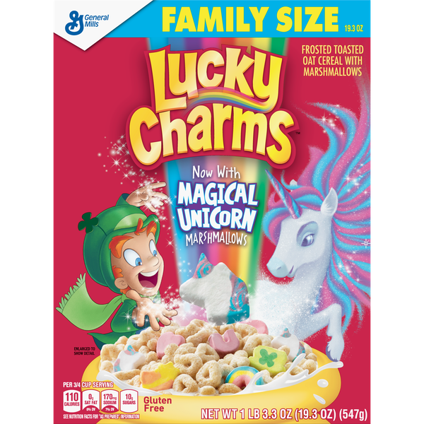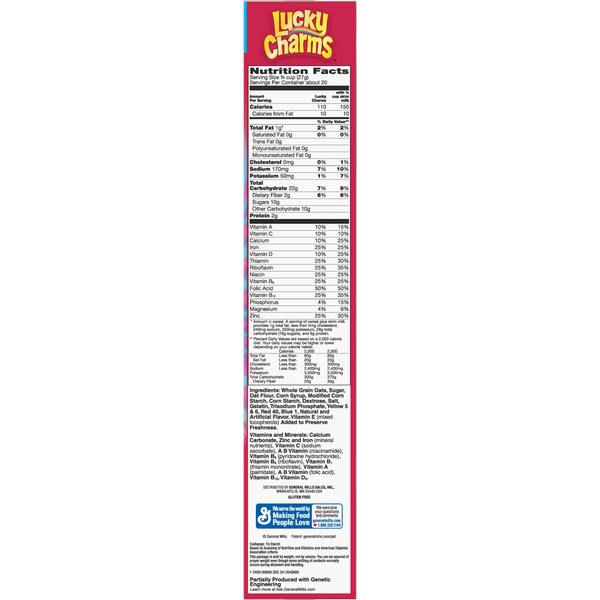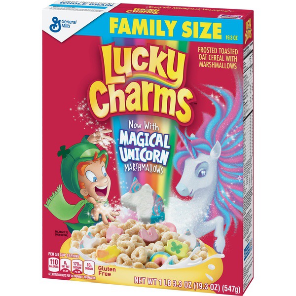 Details Ingredients Whole Grain Oats, Sugar, Oat Flour, Corn Syrup, Modified Corn Starch, Corn Starch, Dextrose, Salt, Gelatin, Trisodium Phosphate, Yellow 5 & 6, Red 40, Blue 1, Natural And Artificial Flavor. Vitamin E (Mixed Tocopherols) Added to Preserve Freshness. Show more Product features Magically Delicious Lucky Charms cereal features frosted oats and colored marshmallows. Made with 11g of whole grain per serving; and it's Gluten Free! All you need to start your day off right is a little bit of magic, and lucky for you, Lucky Charms marshmallows are pretty magical! Hearts, stars, and horseshoes, clovers and blue moons, unicorns, rainbows, and tasty red balloons all make Lucky Charms magically delicious! Made with crunchy, gluten-free oats. CEREAL: Lucky Charms Cereal is a delicious marshmallow breakfast cereal for the entire family to enjoy Magical Marshmallows: Fun Shapes Kids And Adults Will Love, Now With Magical Unicorn Marshmallows! GLUTEN FREE: Gluten free kids breakfast cereal WHOLE GRAIN: 11g of whole grain per serving for a well rounded breakfast or snack KIDS SNACK: Enjoy this sweet, crunchy cereal with milk for breakfast by itself for a school snack Breakfast Cereal; Cold Cereal; Lucky Charm; General Mills Cereal; Marshmallow Cereal; Unicorns Net Quantity of Content 20 X 0.75