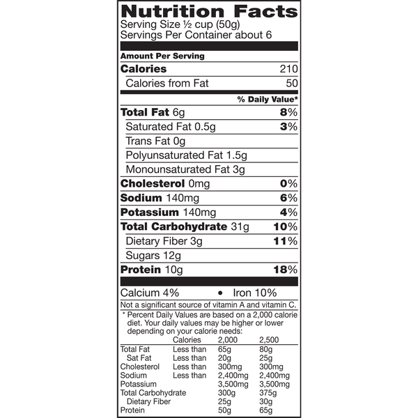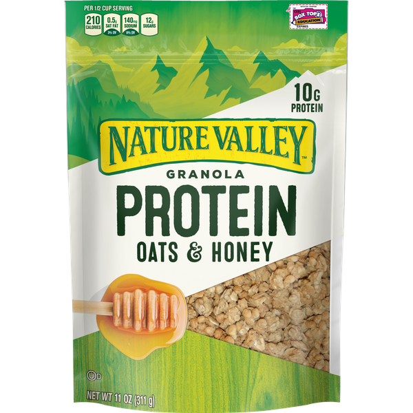Details Ingredients Whole Grain Oats, Sugar, Soy Protein Isolate, Canola Oil, Honey, Molasses, Rice Starch, Soy Lecithin, Baking Soda, Salt, Natural Flavor. Vitamin E (Mixed Tocopherols) Added to Preserve Freshness. Show more Product features Nature Valley Oats & Honey Protein Granola is a feel-good snack that keeps your energy high and hunger low. Whether it's granola cereal, a yogurt parfait or an easy snack, Nature Valley Protein Granola delivers on-the-go energy so you can keep going. Made with real ingredients and No High Fructose Corn Syrup, No Artificial Flavors, No Colors from Artificial Sources and 14g of protein per serving. Nature Valley invented the grain bar category in 1975 and has been providing delicious, wholesome granola products since. Fueled by Nature: Our food brings people the best in nature to deliver satisfying energy. Since 1975, we have grown and used whole grain oats, nuts, nutbutter, seeds, fruit and chocolate to give you the highest quality eating experience possible. Every Nature Valley product tastes remarkable and gives you the energy you need to keep going when your need to do is interrupted by your need to eat. Experience Nature: We inspire people to experience nature more often. Whether it’s feeling the sun on your face, climbing a tree as a kid, hiking your favorite trail or an epic ski run down the highest mountain, we want you to experience the benefits of being in nature. Force for Nature: We preserve and protect nature for generations to come. We proudly support the best of nature with our National Parks partnership in the US. We farm with care and support those who care for nature in good times and in bad. And we strive to reduce our imprint on nature by cracking the code on an affordable and recyclable wrapper. GET OUT THERE: Whether it's granola cereal, a yogurt parfait or an easy snack, Nature Valley Protein Granola delivers energy so you can get outside and keep going PROTEIN PACKED: 14 grams of protein per serving to keep your energy high and your hunger low REAL INGREDIENTS: Hearty 100% whole grain oats sweetened with real honey. No artificial flavors, no artificial colors, and no artificial sweeteners ON-THE-GO SNACK: The same Oats & Honey flavor Nature Valley is known for, without the mess, for a protein snack that lasts CONTAINS: One 11 oz easy close zipper bag of granola Add Protein to Your Day! Cereal; Cold Cereal; Breakfast Cereal; Ready to Eat Cereal; Granola; Nature Valley; Nature's Valley Net Quantity of Content 6 X 1/2 cup (50g)