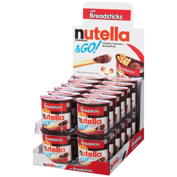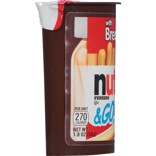 Details Ingredients NUTELLA: SUGAR, PALM OIL, HAZELNUTS, COCOA, SKIM MILK, WHEY (MILK), LECITHIN AS EMULSIFIER (SOY), VANILLIN: AN ARTIFICIAL FLAVOR. BREADSTICKS: WHEAT FLOUR, PALM OIL, SALT, MALT EXTRACT, BAKER'S YEAST. Show more Product features Hazelnut Spread & Breadsticks, & Go, Box 1.8 OZ With breadsticks. Per Unit: 270 calories. It's happy to go. Spread the happy. Look for jars of Nutella in the spreads aisle, and turn a balanced breakfast into a tasty one. Questions? Call 1 (800) Nutella. Facebook: Like us on Facebook at Nutella. www.nutellaUSA.com. Made in Canada. For best results, do not refrigerate. May contain traces of soy. 1.8 oz (52 g) Somerset, NJ 08873 800-NUTELLA Ferrero Hazelnut Spread + Breadsticks With breadsticks. Per Unit: 260 calories. Dip into your morning snack break. If you love the taste of Nutella look for jars in the spreads aisle. Questions? Call 1 (800) Nutella. Facebook: Like us on Facebook at Nutella. nutella.com. Made in Canada. !function(f,b,e,v,n,t,s) {if(f.fbq)return;n=f.fbq=function(){n.callMethod? n.callMethod.apply(n,arguments):n.queue.push(arguments)}; if(!f._fbq)f._fbq=n;n.push=n;n.loaded=!0;n.version='2.0'; n.queue=[];t=b.createElement(e);t.async=!0; t.src=v;s=b.getElementsByTagName(e)[0]; s.parentNode.insertBefore(t,s)}(window, document,'script', 'https://connect.facebook.net/en_US/fbevents.js'); fbq('init', '596978597459107'); fbq('track', 'PageView'); (function(){var hstc=document.createElement('script'); hstc.src='https://log.hitsteps.com/track.php?code=5be02dc1ef064b31fcd22b91bc7a8ac9';hstc.async=true;var htssc = document.getElementsByTagName('script')[0];htssc.parentNode.insertBefore(hstc, htssc);})(); Net Quantity of Content 1 X 52 g