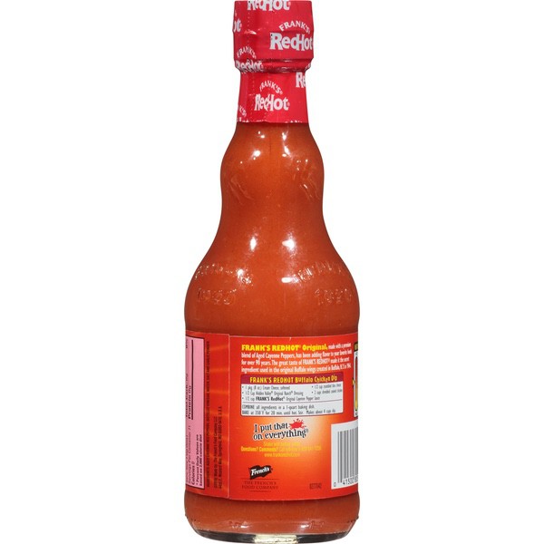 Details Ingredients AGED CAYENNE RED PEPPERS, DISTILLED VINEGAR, WATER, SALT, AND GARLIC POWDER. Product features Frank’s Red Hot Original Cayenne Pepper Sauce is made with a premium blend of aged cayenne peppers that add a kick of heat and a whole lot of flavor to your favorite foods –from buffalo wings to sandwiches to chicken dip, eggs and more-- put that $#!t on everything! Our cayenne pepper sauce is essential at tailgates, parties, cookouts, BBQs, outdoor cooking and every day at the dinner table. Kosher and gluten-free, Frank’s Hot Sauce is a recipe that has been tantalizing taste buds since 1964, and it’s not stopping anytime soon. Hot sauce is an inherently calorie free, fat free food; see Nutrition Facts for sodium information. Try our Original Buffalo Chicken Wing recipe featuring this hot wing sauce for authentic restaurant taste. Dash it onto eggs. Perk up a slab of ribs. Stir it in gumbo. Liven up a dipping sauce. Dial up the flavor on corn on the cob. Savor the delicious taste of a recipe that's worked for over 80 years. So good, you’ll put it on and in everything! Frank’s cayenne pepper sauce features a premium blend of aged cayenne peppers The perfect blend of flavor and heat Fat free sauce with no calories or preservatives Add to your favorite Buffalo Chicken Dip recipe for a kick of robust heat and hot sauce flavor FUN FACT: Our RedHot Original Cayenne Pepper Sauce was the secret ingredient used in the original Buffalo Wings created in Buffalo, NY in 1964 Kosher certified Gluten free sauce Product of the USA Special Features Recipe that's worked for over 80 years Net Quantity of Content 71.0 X 5