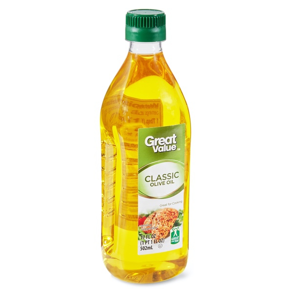 Details Ingredients OLIVE OIL. Product features Great Value Classic Olive Oil is a great addition to any scrumptious meal or cooking situation both at home or in a professional kitchen. This bottle has a screw on top that will allow for you to easily come back to use this at a different point in time if needed. Olive oil goes great on top of salad or used to cook different meats to help prevent sticking to the pan. The taste will be light and delicious, and will go great with Italian American Cuisine dishes such as pasta. Be prepared for the next eloquently succulent meal you make with Great Value Classic Olive Oil. Great Value products provide families with affordable, high quality grocery and household consumable options. With our wide range of product categories spanning grocery and household consumables, we offer you a variety of products for your family's needs. Our products are conveniently available online and in Walmart stores nationwide, allowing you to stock up and save money at the same time Great Value Classic Olive Oil, 17 fl oz Shelf stable Works as a dressing or in a pan Goes great with pasta Great in marinades Great Quality, Great Price, Guaranteed. Special Features 0G trans fat per serving Net Quantity of Content ABOUT 33 X 1 Tbsp