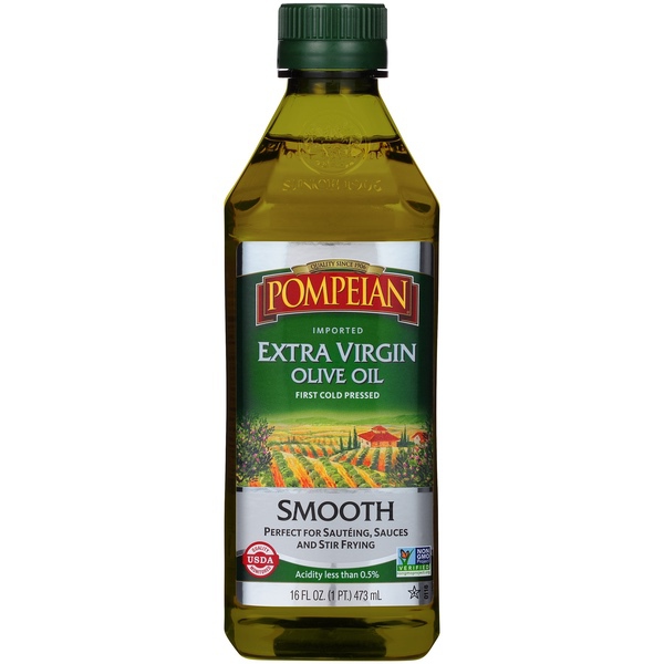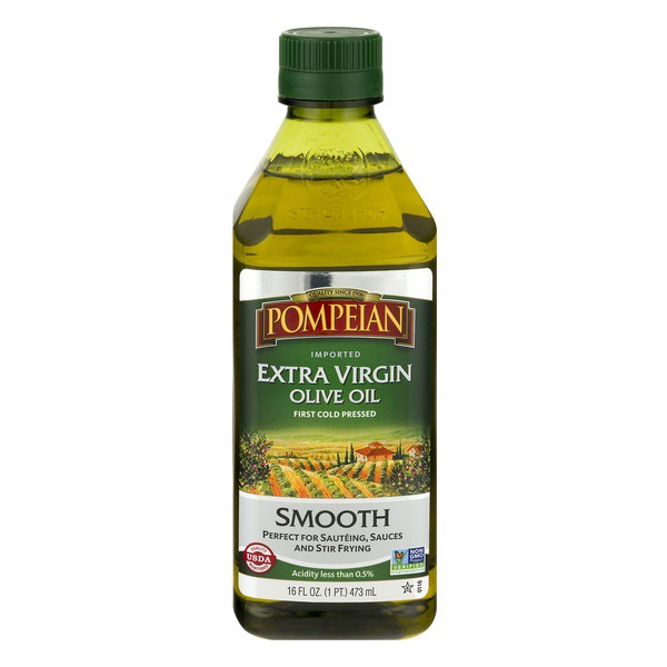 Details Product features Add this Pompeian Imported Olive Oil to your kitchen to open up a world of culinary possibilities. Pompeian works directly with farmers, which ensures that only the finest olives are selected and allows for full traceability of its products. This smooth olive oil is extremely low in acidity (less than 0.5 percent) and is blended with select olives to create a mild, delicate flavor that is ideal for sauteing, sauces and stir frying. It is also useful when grilling to baste food for flavor or on the grill itself to prevent sticking. Plus, this is the first olive oil to attain the USDA Quality Monitored seal, which verifies that it meets the rigorous quality, purity and trace requirements of the USDA. This naturally gluten-free and non-allergenic product offers an excellent way to enjoy delicious Mediterranean cooking. It will make an ideal addition to a home or commercial kitchen. Pompeian Extra Virgin Smooth Olive Oil 16 fl oz Plastic Bottle: First cold pressed Acidity less than 0.5% Imported Ideal for sauteing, sauces and stir frying Quality since 1906 Naturally gluten-free and non-allergenic North American Olive Oil Association certified quality Use to baste food when grilling for flavor and to prevent excessive drying Use on grill grates to prevent sticking Extra virgin olive oil 16 fl oz bottle For more information and cooking tips visit us at www.pompeian.com Net Quantity of Content 32 X 1 Tbsp
