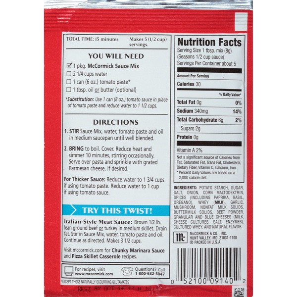 Details Ingredients Potato Starch, Sugar, Salt, Onion, Corn Maltodextrin, Spices (Including Paprika, Basil, Oregano), Whey (Milk), Garlic, Mushroom, Nonfat Milk Solids, Buttermilk Solids, Beet Powder, Granular and Blue Cheeses (Milk, Cheese Cultures, Salt, Enzymes), Cultured Whey, and Natural Flavor. Show more Product features McCormick Italian Mushroom Spaghetti Sauce Seasoning is made with all-natural herbs and spices, with imported mushrooms, onions, garlic and real cheese. And with no MSG or artificial flavors, our seasoning is perfect for infusing your dish with that authentic Italian flavor you crave. Made with natural herbs and spices Real cheese added No MSG No artificial flavors Perfect for sauces, spaghetti and other pastas Special Features McCormick quality spices Net Quantity of Content 5.0 X 8