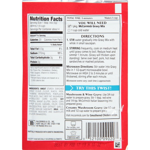 Details Ingredients Wheat Starch, Enriched Wheat Flour (Flour, Niacin, Iron Thiamine Mononitrate, Riboflavin, Folic Acid), Salt, Beef Fat, Mushroom, Hydrolyzed Corn Gluten, Soy Protein, Wheat Gluten, Onion, Corn Syrup Solids, Caramel Color, Beef Extract, Corn Maltodextrin, Garlic, Spices, Sodium Caseinate (Milk), and Disodium Inosinate and Guanylate (Flavor Enhancers). Show more Product features McCormick Mushroom Gravy provides your family with a savory, lump-free treat you can feel good about. Made with McCormick spices, this blend doesn't contain MSG or artificial flavors or colors, so you can serve over roasts, potatoes, stuffing and more knowing you're serving your family the very best. Add a tablespoon of red wine for a deliciously mature twist. Made with McCormick herbs and spices No MSG No artificial flavors or colors added Expertly blended spices offers quick, delicious meals Delivers delicious, lump-free mushroom gravy Special Features McCormick quality spices Net Quantity of Content 4.0 X 5