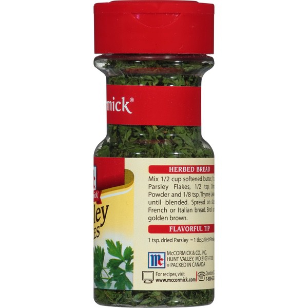 Details Ingredients Parsley Flakes Product features McCormick Parsley Flakes bring mild, herby flavor and attractive color to everyday dishes and holiday fare. Our Parsley Flakes are dried within hours of harvest so that they retain their characteristic parsley flavor and green color. What wouldn’t benefit from a sprinkling of parsley? It lends the perfect sprinkle of color for everything from scrambled and deviled eggs to potatoes, noodles and carrots. In addition to its use as a garnish, parsley also offers mild, herby flavor that doesn’t overpower the tastes of foods like chicken, seafood, pasta and vegetables. Add parsley flakes to seasoning blends, breading mixes, and herbed butters and sauces. Use 1 tsp. Parsley Flakes in place of 1 Tbsp. chopped fresh parsley. Mild, herby flavor Dried within hours of harvest Attractive green color makes it an ideal garnish for almost any dish Non GMO Mild flavor does not overpower tastes of chicken, seafood, pasta & vegetables Mix with melted butter and toss with noodles, potatoes or cauliflower Special Features The taste you trust