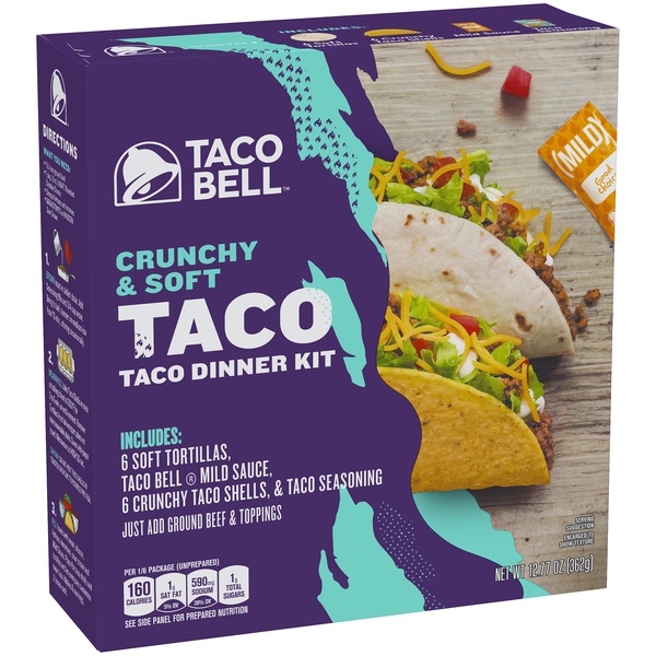 Details Ingredients Ingredients: Wheat Flour, Salt, Garlic*, Chili Peppers*, Spice, Onions*, Maltodextrin, Paprika, Sugar, Contains Less Than 2% Of Silicon Dioxide As An Anticaking Agent, Natural Flavor, Yeast Extract, Soybean Oil, Malic Acid *Dried Show more Product features Taco Bell Crunchy & Soft Taco Dinner Kit will make every night feel like Taco Bell night. The restaurant-quality taco shells and tortillas are made with yellow corn and flour and are paired with delicious taco seasoning and one-of-a-kind Taco Bell Mild Sauce. This kit is sure to make dinner a fiesta and will excite the taste buds of everyone in the family. Simply add ground beef and toppings to complete your Taco Bell dinner. Preparation is easy, brown your ground beef in a skillet, add the seasoning mix along with 3/4 cups of water, and bring to a boil and simmer for 10 minutes. Bake taco shells on baking sheet in the oven for 3-5 minutes, and microwave tortillas for 30 seconds. Dress up your crunchy tacos with sour cream, salsa, shredded lettuce, tomatoes and more. One 12.77 ounce taco kit makes about 6 servings. Make it Taco Bell tonight. One 12.77 Ounce. box of Taco Bell Crunchy & Soft Taco Dinner Kit Create a delicious dinner everyone will love with the Taco Bell Crunchy & Soft Taco Dinner Kit Each box includes 6 crunchy taco shells, 6 soft tortillas, Taco Bell Mild Sauce and taco seasoning Just add ground beef and your favorite toppings Serve with salsa, sour cream, cheese, lettuce, tomatoes and more Net Quantity of Content 6.0 X 1/6pkge (60g/ 1 tortilla, 1 Tbsp sce, 1 taco shell, 2 tsp seasoning
