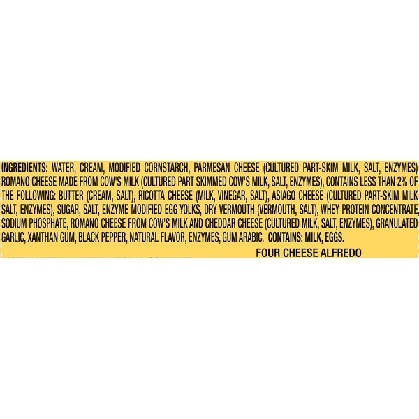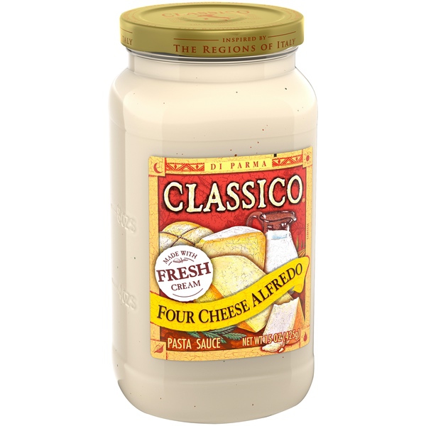 Details Ingredients Ingredients: Water, Cream, Modified Cornstarch, Parmesan Cheese (Cultured Part Skim Milk, Salt, Enzymes), Romano Cheese Made From Cow's Milk (Cultured Part Skimmed Cow's Milk, Salt, Enzymes), Contains Less Than 2% Of The Following: Butter (Cream, Salt), Ricotta Cheese (Milk, Vinegar, Salt), Asiago Cheese (Cultured Part Skim Milk, Salt, Enzymes), Sugar , Salt, Enzyme Modified Egg Yolks, Dry Vermouth (Vermouth, Salt), Whey Protein Concentrate, Sodium Phosphate, Romano Cheese From Cow's Milk And Cheddar Cheese (Cultured Milk, Salt, Enzymes), Granulated Garlic , Xanthan Gum, Black Pepper, Natural Flavor, Enzymes, Gum Arabic. Contains: Milk, Eggs. Show more Product features Classico Four Cheese Alfredo Pasta Sauce is made the way the earliest Alfredo sauces were made in Rome. Here, fresh cream is blended with Ricotta cheese, Parmesan cheese, Romano cheese, and Asiago cheese for an authentic rich and creamy flavor. This gluten free pasta sauce helps you create exciting and delicious meals such as chicken Alfredo and shrimp Alfredo easily. Just simmer the sauce and pair it with pasta or a dish of your choice to enjoy an authentic Italian style dinner. This Classico Alfredo sauce is stored in a 15 ounce vacuum sealed jar until ready to use. Refrigerate Classico Four Cheese Alfredo Pasta Sauce after opening. One 15 Ounce. jar of Classico Four Cheese Alfredo Pasta Sauce Classico Four Cheese Alfredo Pasta Sauce is made with fresh cream This Alfredo sauce features Ricotta cheese, Parmesan cheese, Romano cheese, and Asiago cheese This Parmesan cream sauce is completely gluten free Use this Alfredo as an Italian style pasta sauce, white pizza sauce, or dipping sauce Special Features Ham And pasta salad recipe Net Quantity of Content 7.0 X 1/4 Cup (60g)