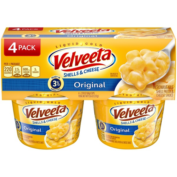 Details Ingredients Ingredients: Enriched Macaroni Product (Wheat Flour, Glycerol Monostearate, Niacin, Ferrous Sulfate [Iron], Thiamin Mononitrate [Vitamin B1], Riboflavin [Vitamin B2], Folic Acid); Cheese Sauce (Milk, Whey, Whey Protein Concentrate, Canola Oil, Water, Sodium Phosphate, Milk Protein Concentrate, Salt, Contains Less Than 2% Of Lactic Acid, Sodium Alginate, Sorbic Acid As A Preservative, Cheese Culture, Oleoresin Paprika [Color], Enzymes, Milkfat, Annatto Extract [Color], Natural Flavor); Modified Food Starch, Maltodextrin, Acetylated Monoglycerides, Salt, Medium Chain Triglycerides, Apocarotenal (Color). Show more Product features Velveeta Original Shells and Cheese Cups are an easy dinner that's ready in just minutes. Kids and adults love the rich taste and creamy texture of pasta shells with cheesy goodness. This easy shells and cheese meal includes shell pasta and original cheese sauce so you have everything you need to make a quick dinner. This microwave macaroni and cheese is always a great choice for dorm food or a tasty single serve dinner at home. Preparing this microwave dinner is a breeze just add water up to the line, microwave for 3-1/2 minutes and stir in the cheese sauce mix. Add a little liquid gold to all your meals with Kraft Velveeta. One sleeve of four 2.39 oz. cups of Velveeta Original Shells and Cheese Cups Velveeta Original Shells and Cheese Cups are an easy dinner that's ready in 3 1/2 minutes Easy shells and cheese meal includes shell pasta and original cheese sauce Contains no trans fats per serving Macaroni and cheese is a classic single serve meal or dorm food Easy shells and cheese dish is microwaveable for convenience Pasta shells and original cheese sauce are individually sealed for lasting freshness Special Features Microwaveable Net Quantity of Content 4.0 X 1 Package (68 g)