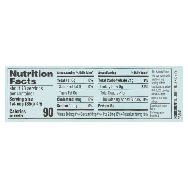 Details Ingredients LIGHT RED KIDNEY BEANS. Product features Take your culinary creations to the next level with Great Value Light Red Kidney Beans. They're an excellent accompaniment to soups, salads, rice, and more! To prepare, slowly simmer these soaked and rinsed beans to mouth-watering perfection on the stove for an hour or two. With 8 grams of protein and 9 grams of fiber in every ¼ cup serving, adding these kidney beans to your meal will help keep you full all day long. Our Great Value Light Red Kidney Beans have earned our esteemed Good For You label, which means they have met rigorous nutrition criteria informed by the latest nutrition science and authoritative guidance from the 2010 Dietary Guidelines for Americans, U.S. Food and Drug Administration (FDA), U.S. Department of Agriculture (USDA), and Institute of Medicine (IOM). Get creative in the kitchen and enjoy the incredible taste of Great Value Light Red Kidney Beans in your next recipe. Great Value products provide families with affordable, high quality grocery and household consumable options. With our wide range of product categories spanning grocery and household consumables, we offer you a variety of products for your family's needs. Our products are conveniently available online and in Walmart stores nationwide, allowing you to stock up and save money at the same time. Light red kidney beans No salt added Great for you 1lb package Gluten-free 8g of protein and 9g of fiber per ¼ cup serving Special Features High in fiber Net Quantity of Content ABOUT 13 X 0.25 cup