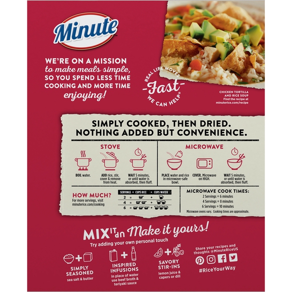 Details Ingredients ENRICHED PRECOOKED LONG GRAIN RICE [RICE, NIACIN, IRON (FERRIC ORTHOPHOSPHATE), THIAMIN (THIAMIN MONONITRATE), FOLIC ACID]. Show more Product features Minute Instant White Rice is a delicious addition to any meal. It is made with no preservatives or MSG and is both gluten-free and non-GMO, so you can rest assured that our products are made with your health in mind. In just 5 minutes, you'll have delectable rice that is sure to enhance any meal. This long grain rice is enriched, precooked, and then dried with nothing added but pure convenience. Feel free to get creative with dinner by adding veggies, proteins or sauces to your rice or cook the rice in broths/fruit juices in place of water. Each order includes one 72-ounce box of instant rice at the ready! Minute Rice is part of Riviana Foods, Inc. and, since 1949, has consistently brought the goodness of quality rice products right to the American farmer and right to your dinner table. Delight your taste buds, enjoy your meal, and love every Minute! Easy-to-make long grain rice for a variety of healthy dishes Cooks up in just 1 minute! Non-GMO Project Verified and Kosher Completely gluten-free Made with zero preservatives Great for those with an eye on their cholesterol as well as on the time! Includes one 72-ounce box of instant enriched rice Net Quantity of Content ABOUT 44 X 0.5 cup