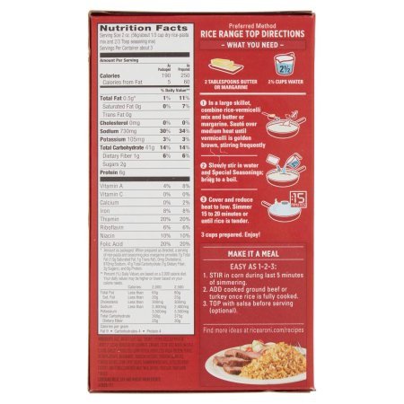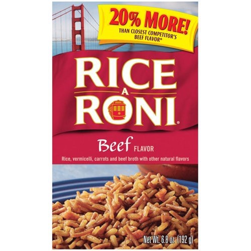 Details Ingredients Rice, Wheat Flour, Durum Wheat Semolina, Salt, Onions Dried, Hydrolyzed Protein Corn, Soy and Wheat, Carrots Dried, Sugar, Monosodium Glutamate, Caramel Color, Beef Broth Dried, Natural Flavor, Garlic Dried, Autolyzed Yeast Extract Dried, Hydrolyzed Gluten Wheat and Corn and Hydrolyzed Soy Protein, Disodium Inosinate, Niacin, Disodium Guanylate, Ferric Orthophosphate, Ferrous Sulfate, Thiamin Mononitrate, Milk, Folic Acid, Riboflavin Show more Product features Rice, vermicelli, carrots and beef broth with other natural flavors. Join the trolley on a taste adventure around the world. From the zesty to the savory to every delicious corner of the earth, Rice-a-Roni takes you on an exciting flavor journey. The San Francisco Treat. Same great taste!. Warnings: Contains wheat, soy and milk ingredients. Ingredients: Rice, Wheat Flour, Salt, Onions*, Hydrolyzed (Soy, Corn and Wheat Protein, Wheat and Corn Gluten), Carrots*, Sugar, Monosodium Glutamate, Caramel Color, Beef Broth*, Natural Flavors, Garlic*, Autolyzed Yeast Extract*, Chicken Fat, Disodium Inosinate, Niacin, Disodium Guanylate, Ferric Orthophosphate, Ferrous Sulfate, Thiamin Mononitrate, Milk, Folic Acid, Riboflavin, Soy Protein. *Dried. Prepare for a stampede to the dinner table when you serve our delicious rice and vermicelli blended with the savory flavors of onions, carrots, beef broth and garlic! Special Features 20% more Net Quantity of Content ABOUT 3 X 2 oz