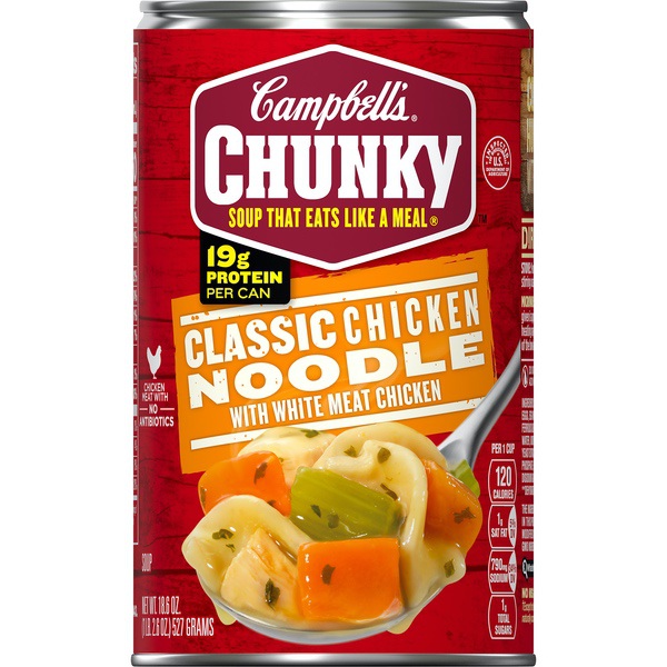Details Ingredients Ingredients: Chicken Stock, White Meat Chicken, Carrots, Enriched Egg Noodles (Wheat Flour, Eggs, Egg Whites, Wheat Protein Isolate [Wheat Gluten, Phosphate, Lactic Acid, Sulfites], Niacin, Ferrous Sulfate, Thiamine Mononitrate, Riboflavin, Folic Acid), Celery, Contains Less Than 2% Of: Water, Modified Food Starch, Salt, Chicken Fat, Potassium Chloride, Soy Protein Concentrate, Yeast Extract, Sugar, Mechanically Separated Chicken**, Onions**, Cooked Chicken Skins, Sodium Phosphate, Flavoring, Spice, Beta Carotene For Color, Vegetable Broth**, Disodium Inosinate, Disodium Guanylate, Chicken**, Egg Yolks, Soy Lecithin. **Dehydrated Show more Product features Campbell's Chunky Classic Chicken Noodle Soup isn’t just tasty-it's made to work as hard as you do. With never-ending big flavors and bold ingredients, our comfort food classic is capable of fueling even the heartiest appetite. Crafted with big pieces of chicken meat with no antibiotics, chunks of quality vegetables and enriched egg noodles, we load every can with the fill-you-up flavors that you'll never stop loving. Classic chicken noodle soup made with big pieces of chicken meat with no antibiotics, chunks of quality vegetables and enriched egg noodles Packaged in a 18.6 oz. non-BPA-lined, recyclable can No MSG Added Perfect to grab when you're hungry and crunched for time Count on this classic to satisfy the heartiest of appetites Special Features Good source of protien Net Quantity of Content 2.0 X 1 CUP (240mL)